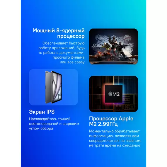 | Комплект поставки | iPad Air 2024, Кабель USB-C для зарядки (1 м), Адаптер питания USB-C мощностью 20 Вт |