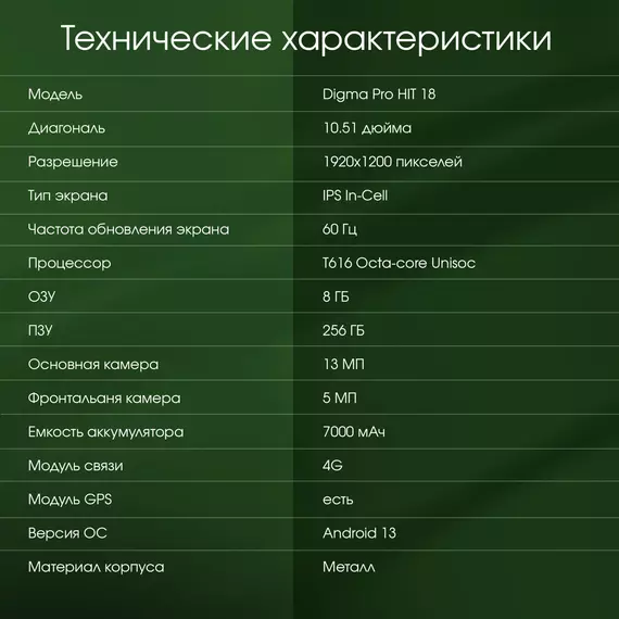 Планшет Digma Pro HIT 18 T616 (2.0) 8C RAM8Gb ROM256Gb 10.5" IPS 1920x1200 4G 2Sim Android 13 фиолетовый 13Mpix 5Mpix BT WiFi microSD 512Gb 7000mAh 5hr [HS1011PL]