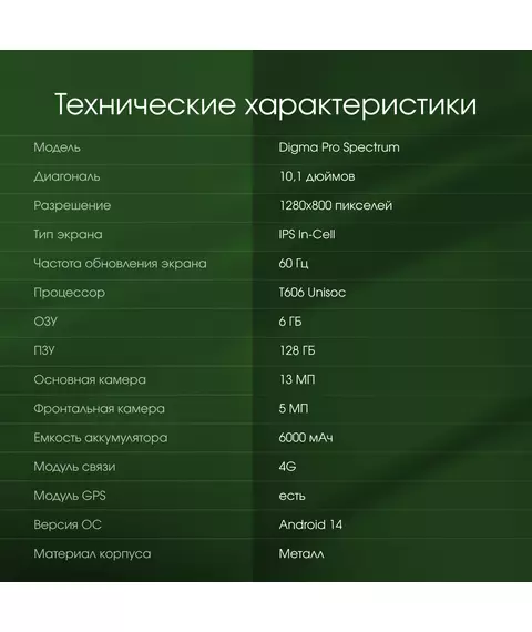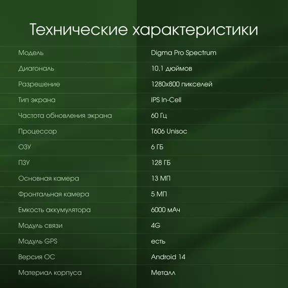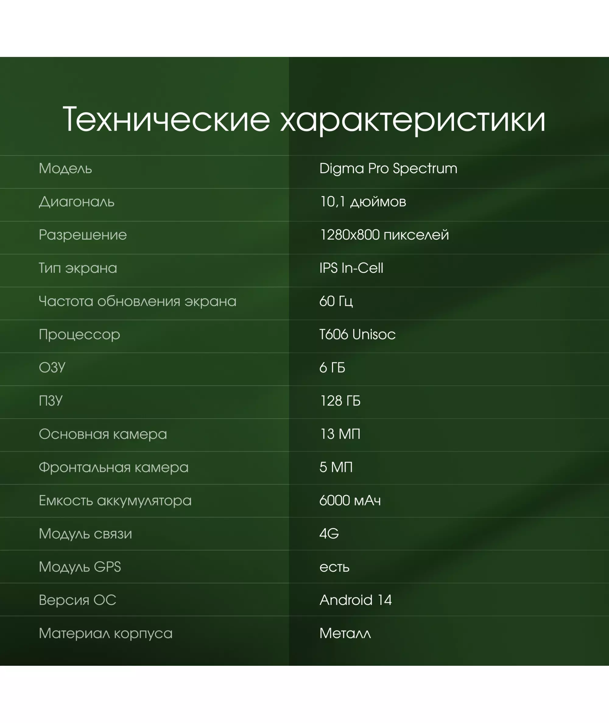 Планшет Digma Pro Spectrum T606 (1.6) 8C RAM6Gb ROM128Gb 10.1" IPS 1280x800 4G 2Sim Android 14 темно-серый 13Mpix 5Mpix BT WiFi microSD 512Gb 6000mAh [TA2D0P02]