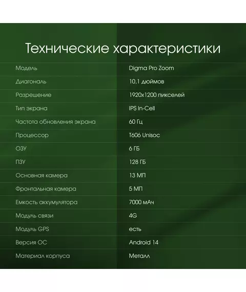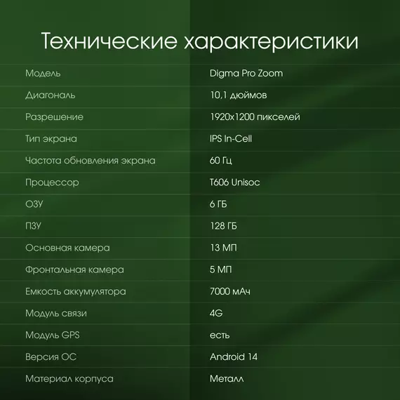 Планшет Digma Pro Zoom T606 (1.6) 8C RAM6Gb ROM128Gb 10.1" IPS 1920x1200 4G 2Sim Android 14 темно-серый 13Mpix 5Mpix BT WiFi microSD 1Tb 7000mAh 24hr 94hrs [TA2D0P03]