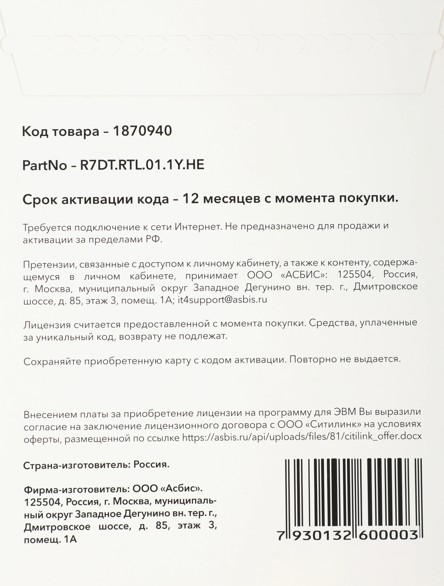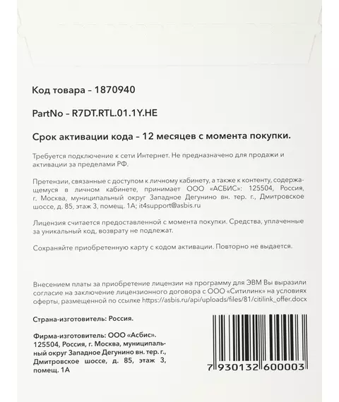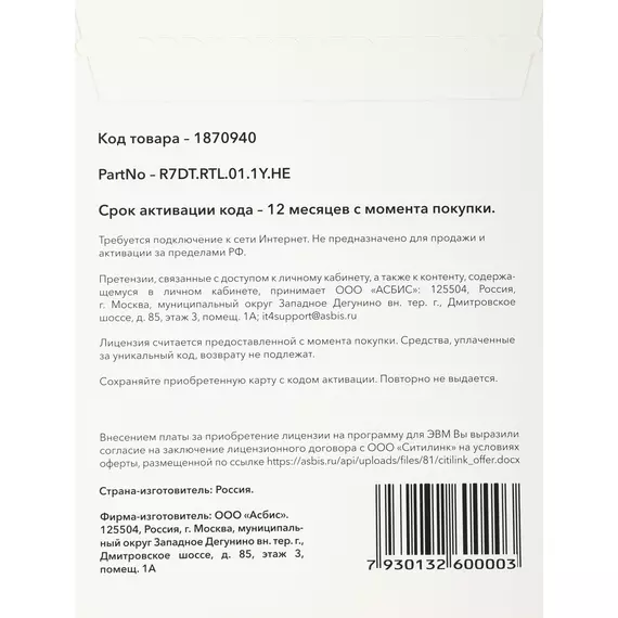 | Срок действия лицензии (мес.) | 12 мес |