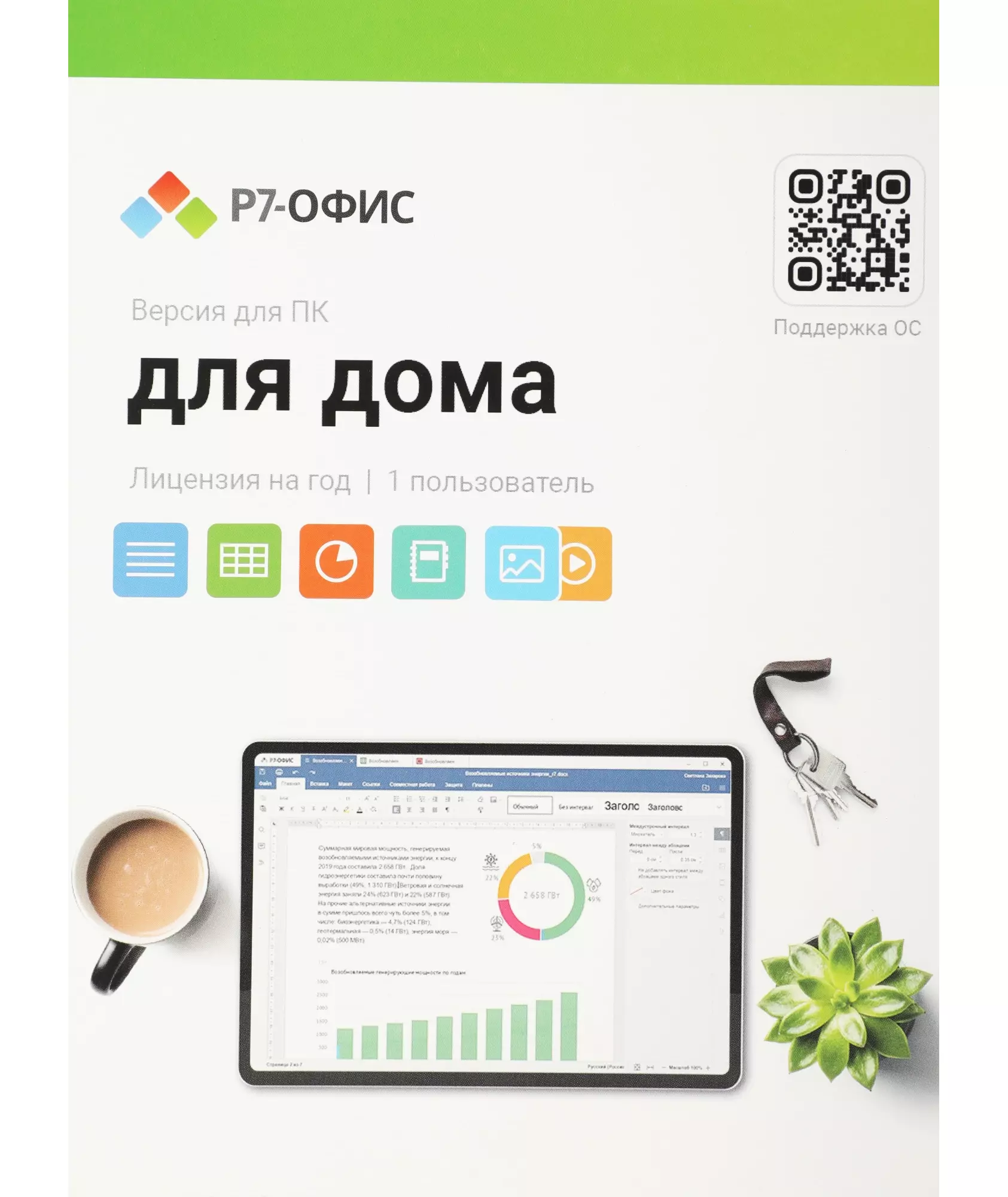 Лицензия на 1 пользователя на 1 год. В пакет входит: текстовый редактор, редактор электронных таблиц, редактор презентаций, средства просмотра видео и изображений, органайзер.
