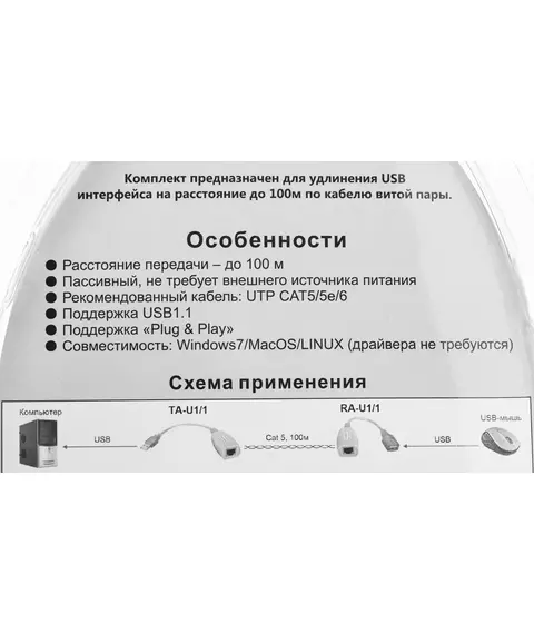 Удлинитель USB 1.1 интерфейса для клавиатуры и мыши по кабелю витой пары (CAT5/5e/6) до 100м, USB звуковые платы и т.д. до 70 м