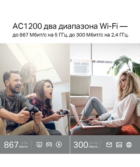 - Одновременные подключения до 300 Мбит/с на 2,4 ГГц и до 867 Мбит/с на 5 ГГц — общая скорость до 1200 Мбит/с