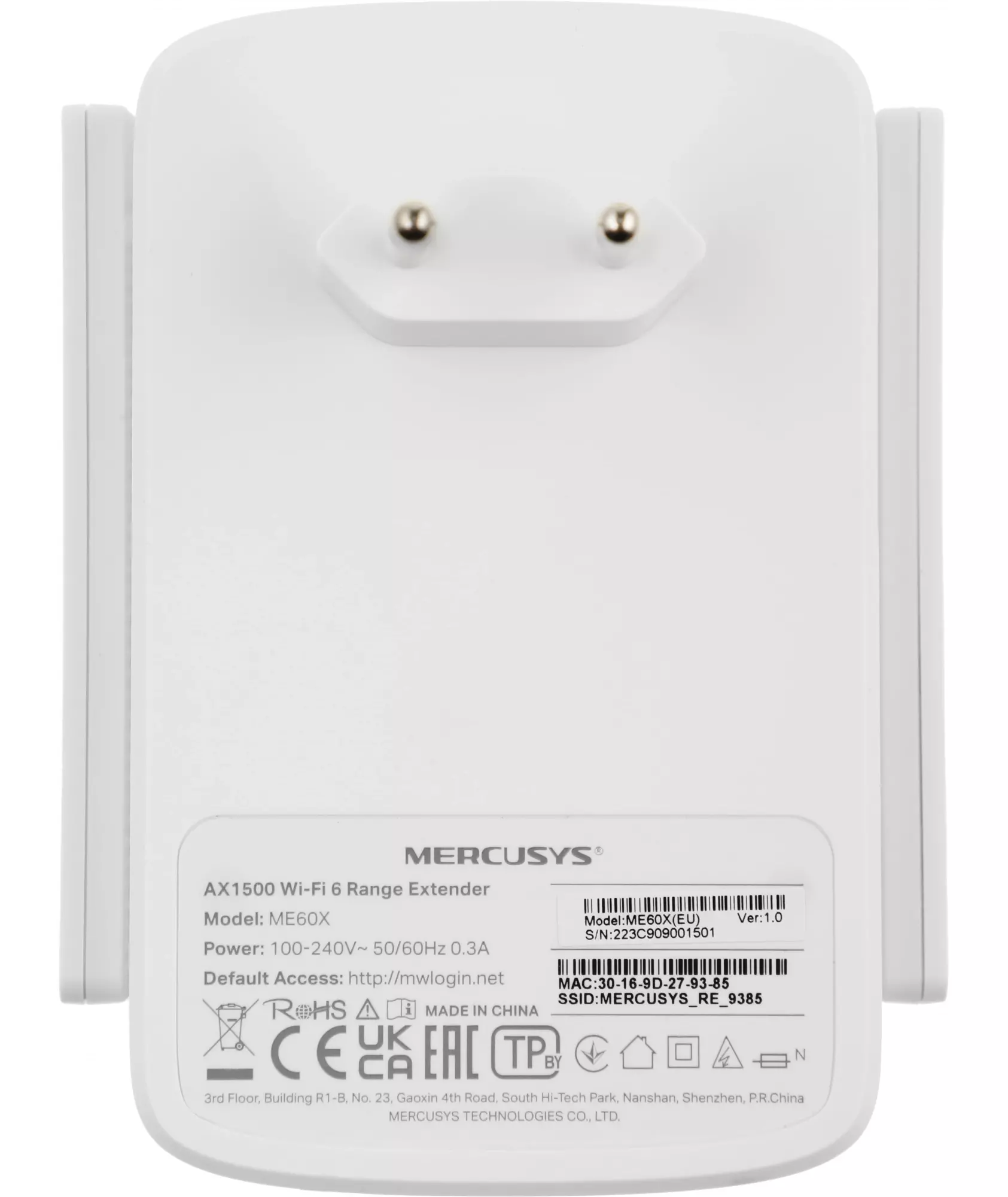 Повторитель беспроводного сигнала Mercusys ME60X AX1500, 10/100/1000BASE-TX, белый