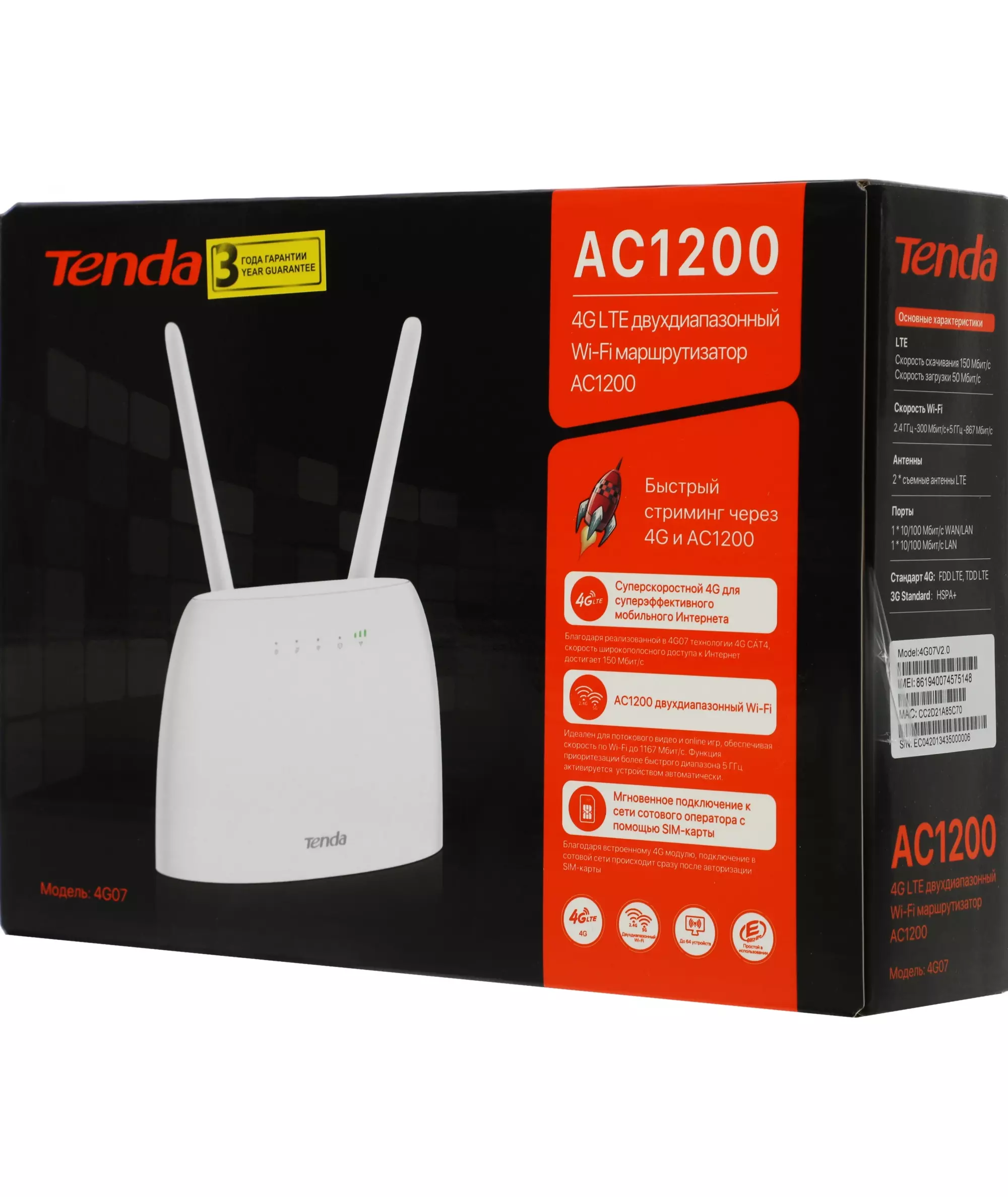 Роутер беспроводной TENDA 4G07 AC1200 10/100BASE-TX/3G/4G cat.4 белый