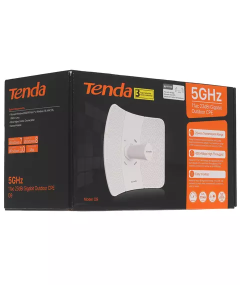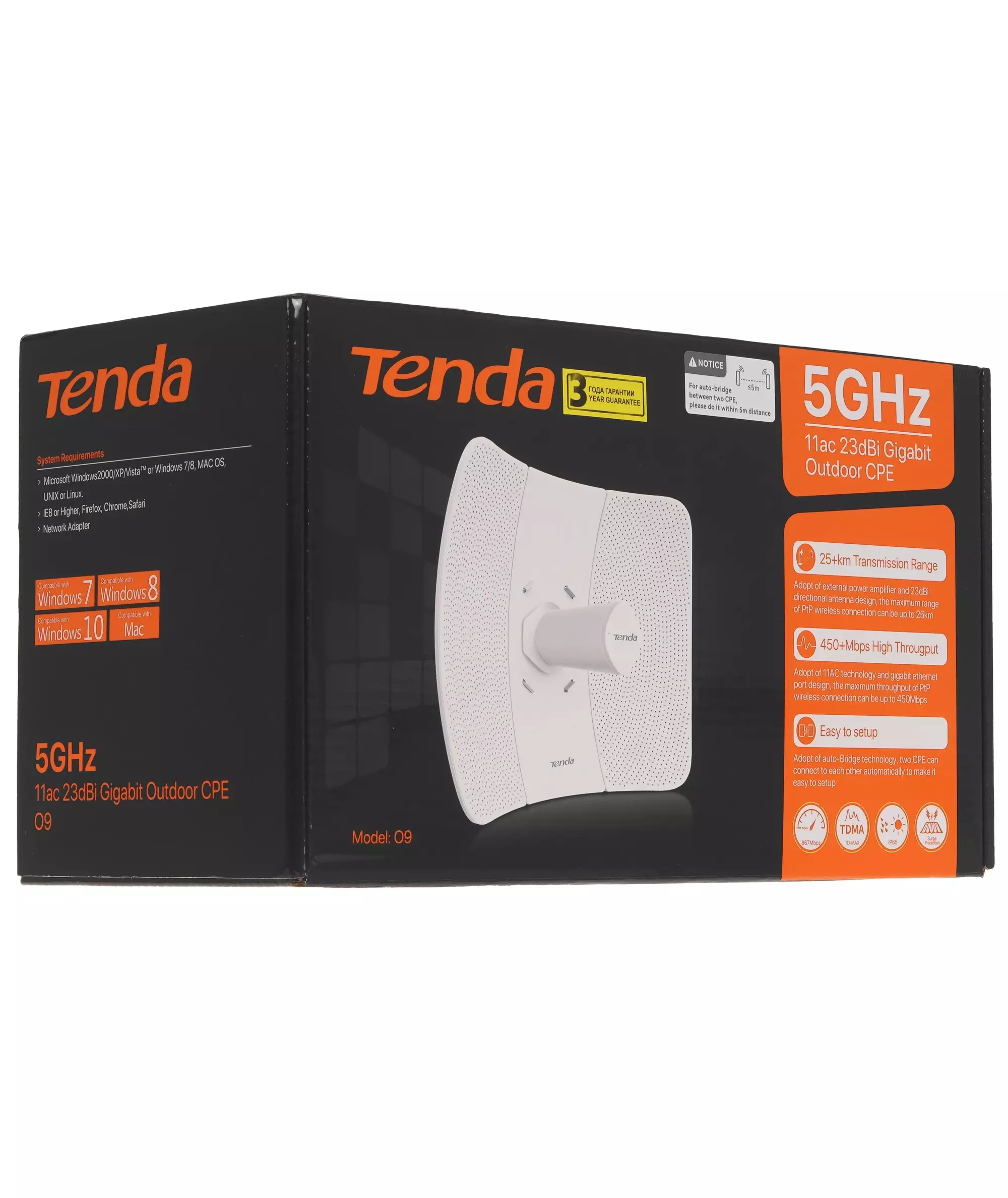 Tenda O9 — это эффективное решение для организации беспроводного соединения на больших расстояниях. Устройство поддерживает частоту 5 ГГц, оснащено мощной внешней антенной и надёжно защищено от внешних воздействий, что делает его отличным выбором для уличного использования.