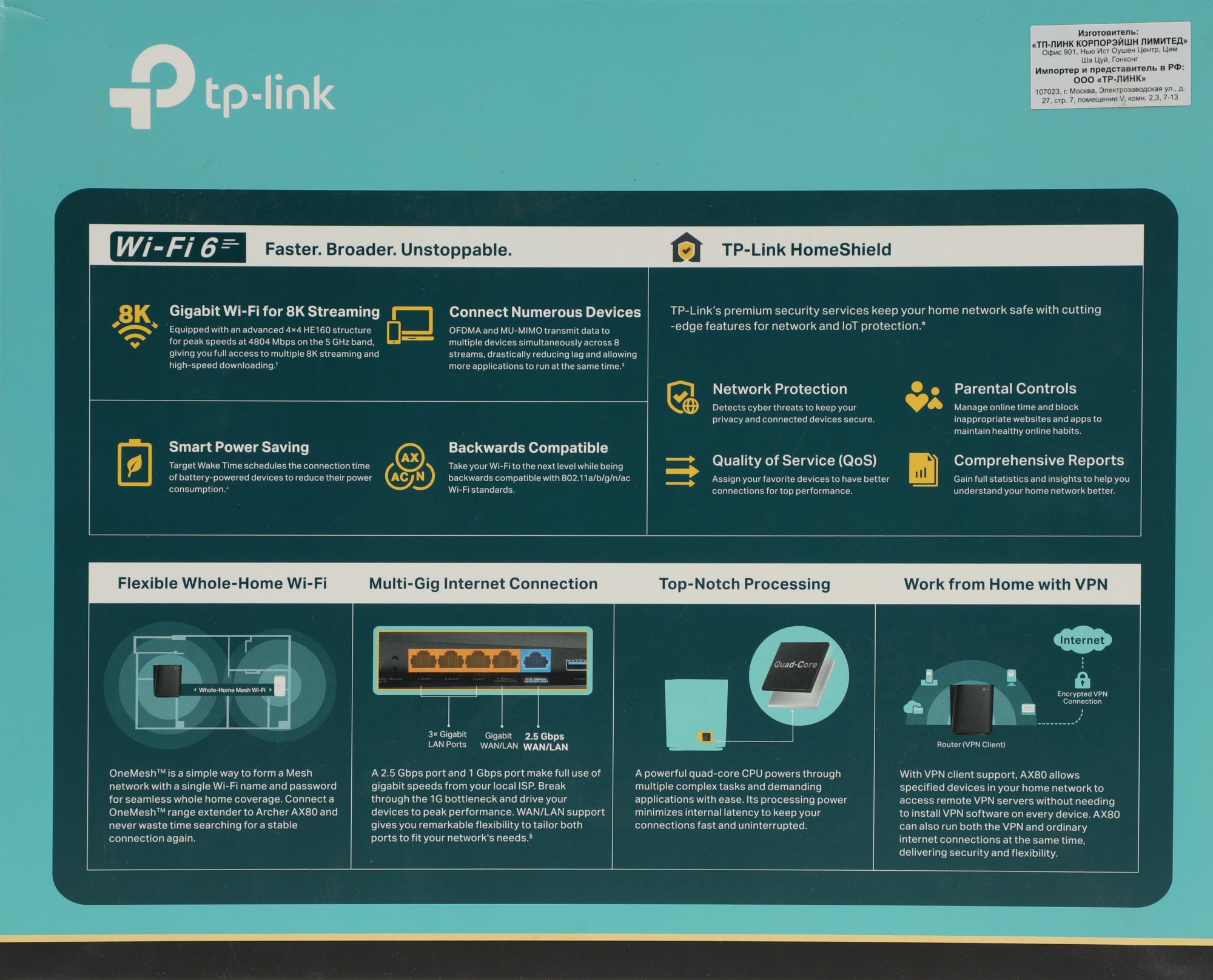 Больше подключений, меньше задержек: технологии OFDMA и MU-MIMO обеспечат передачу данных на несколько устройств одновременно. Мощный процессор: передовой четырёхъядерный процессор обеспечит высокую скорость передачи и подключение без задержек.