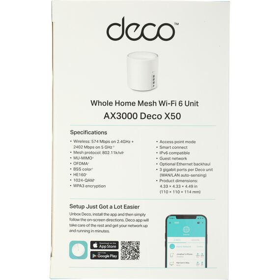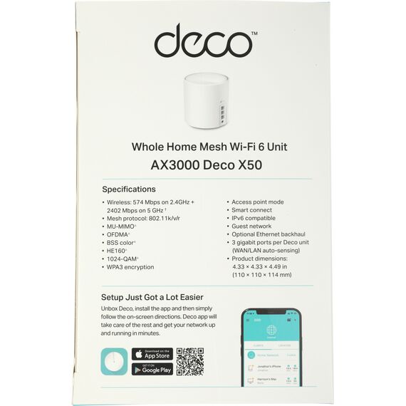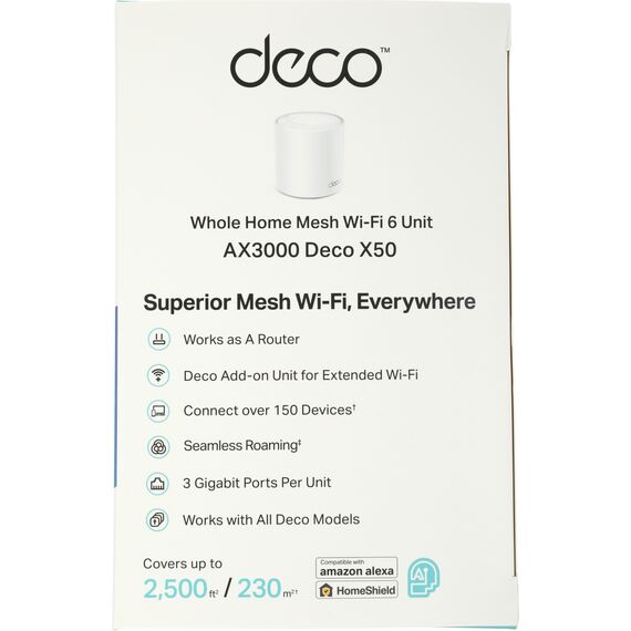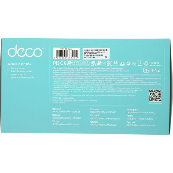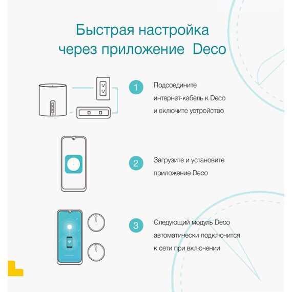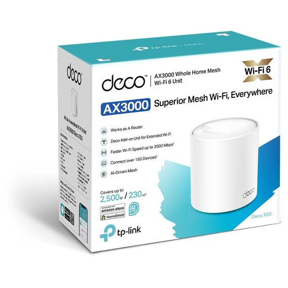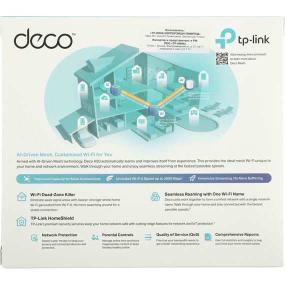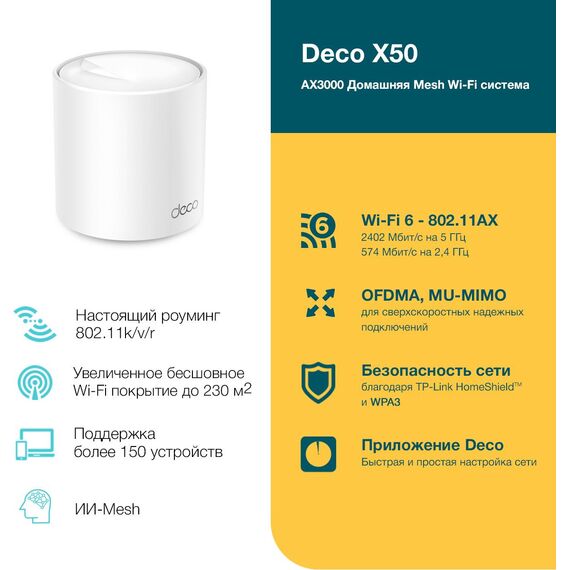 | Комплектация | Deco X50 (1 шт.), Кабель Ethernet RJ45, Адаптер питания (1 шт.), Руководство по быстрой настройке |