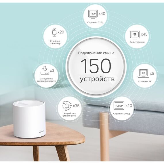 Домашняя Mesh Wi-Fi система TP-Link Deco X60(2-pack) AX3000, Wi-Fi 6, 2402 Мбит/с (4 потока) на 5 ГГц и 574 Мбит/с (2 потока) на 2,4 ГГц, 2 гигабитных порта на каждом модуле, поддержка OFDMA, MU-MIMO, бесшовный роуминг 802.11k/v/r