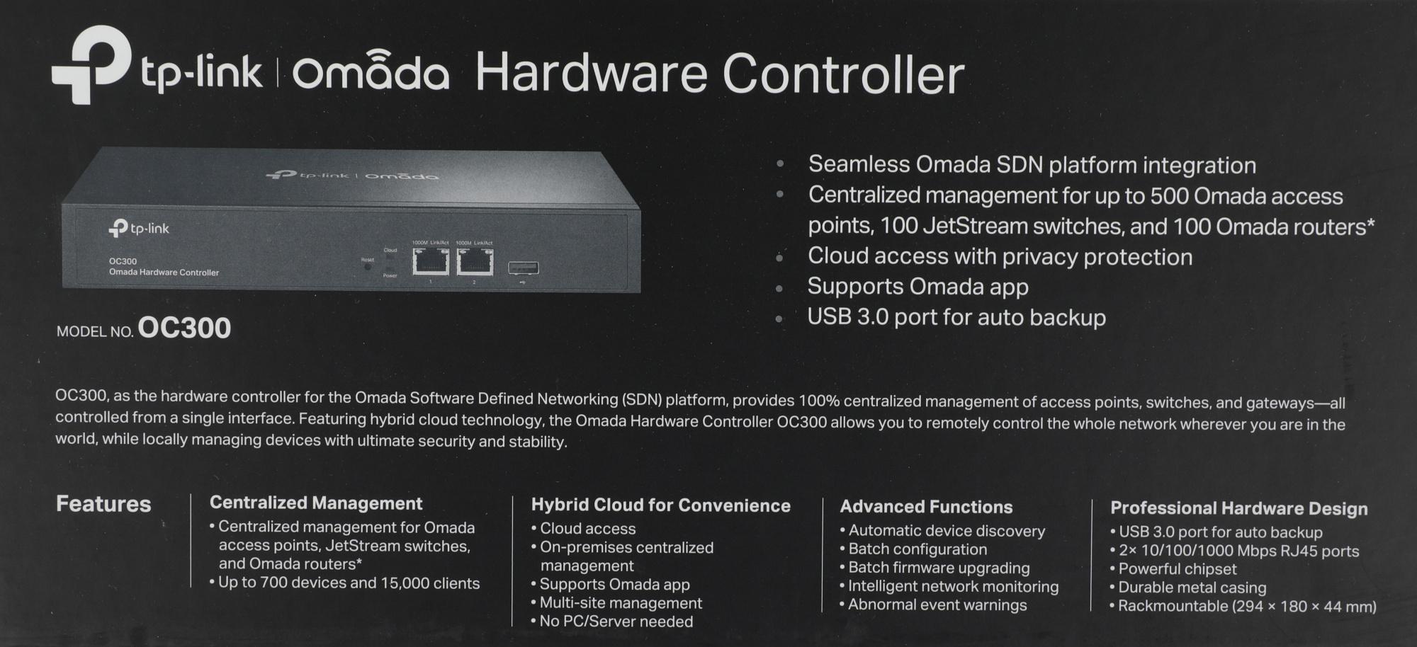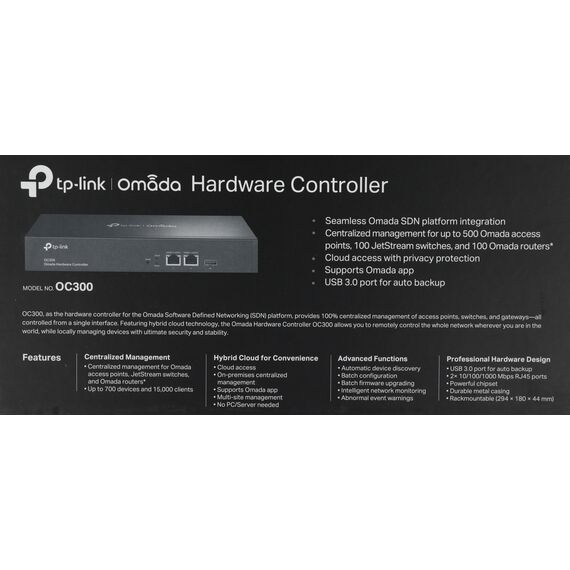 OC300 – это аппаратный контроллер для платформы Omada SDN. Он обеспечивает 100% централизованное управление точками доступа, коммутаторами и шлюзами из единого интерфейса.