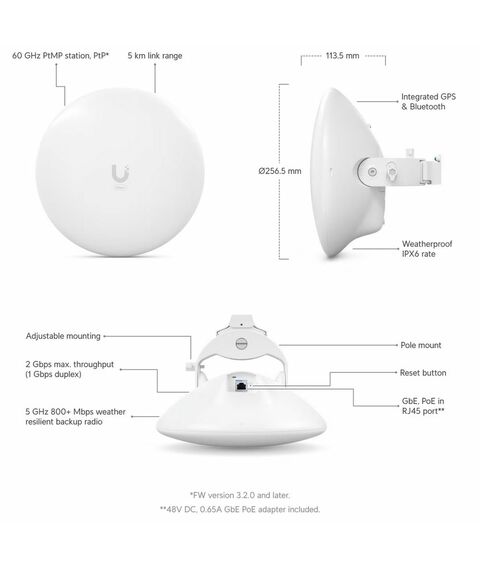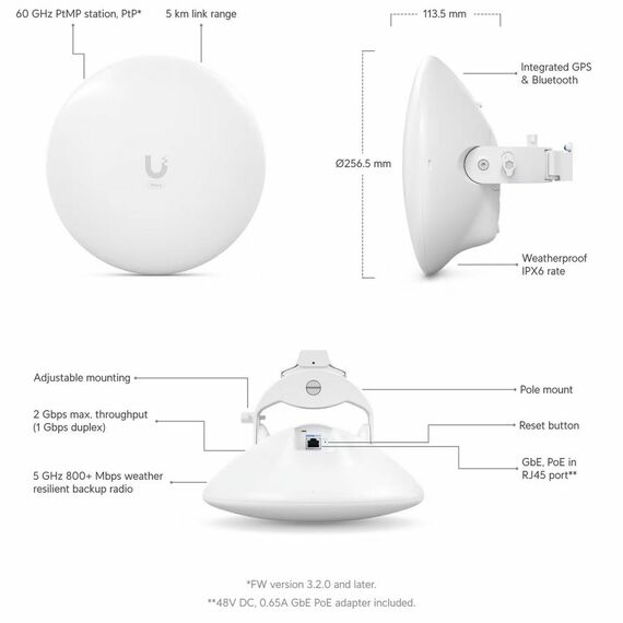 | Особенности | Абонентское устр-во для PtP и PtMP на расстоянии до 5км. Антенна 41dBi. Пропускная способность - 2Gbps. Резервный модуль 5ГГц(802.11ax/19dBi). GPS. IPx6 |
