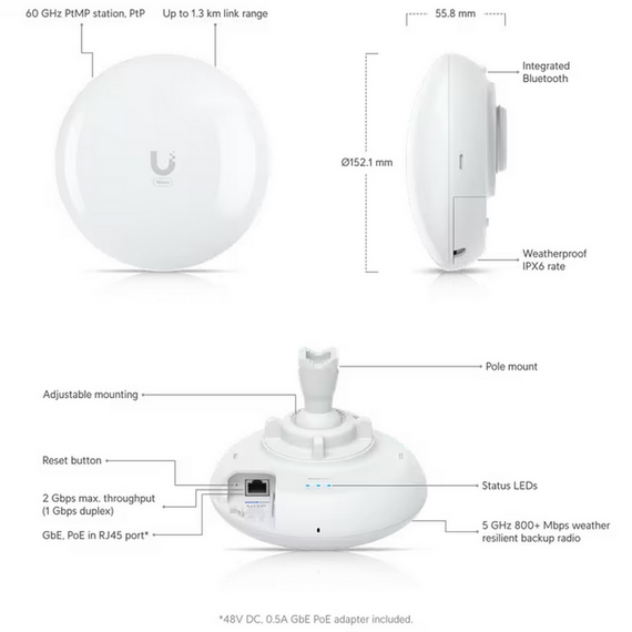 | Особенности | Абонентское устр-во для PtP и PtMP на расстоянии до 1.3км. Антенна 27.7dBi. Резервный модуль 5ГГц(802.11ax/9dBi). IPx6 |