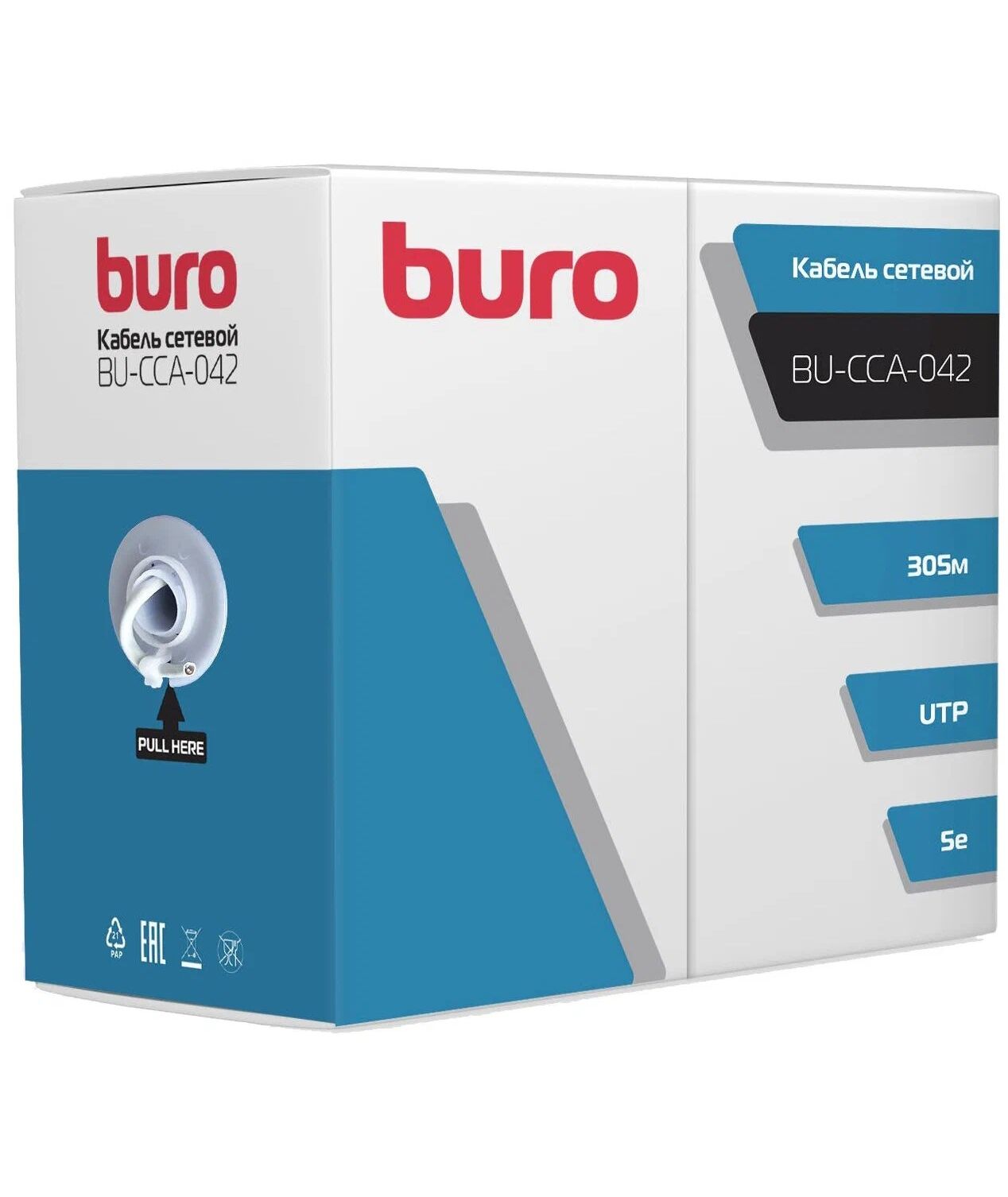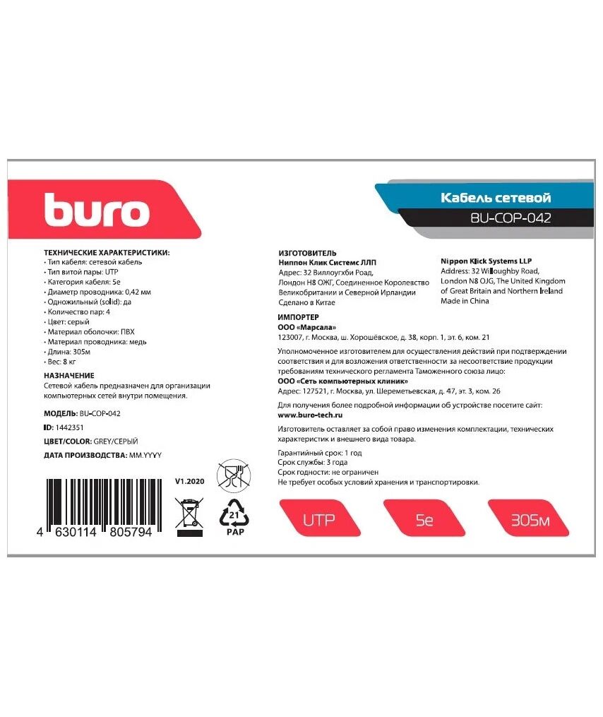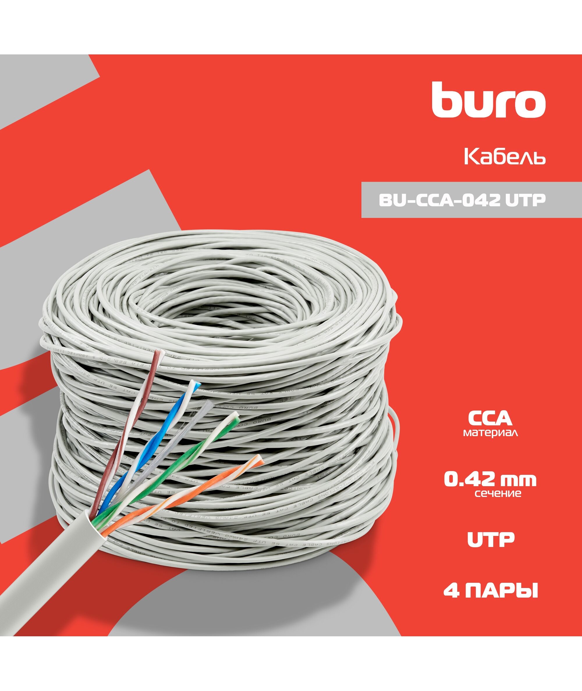 Кабель сетевой BURO BU-CCA-042 UTP 4 пары cat.5E solid 0.42мм CCA 305м серый