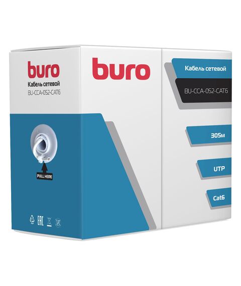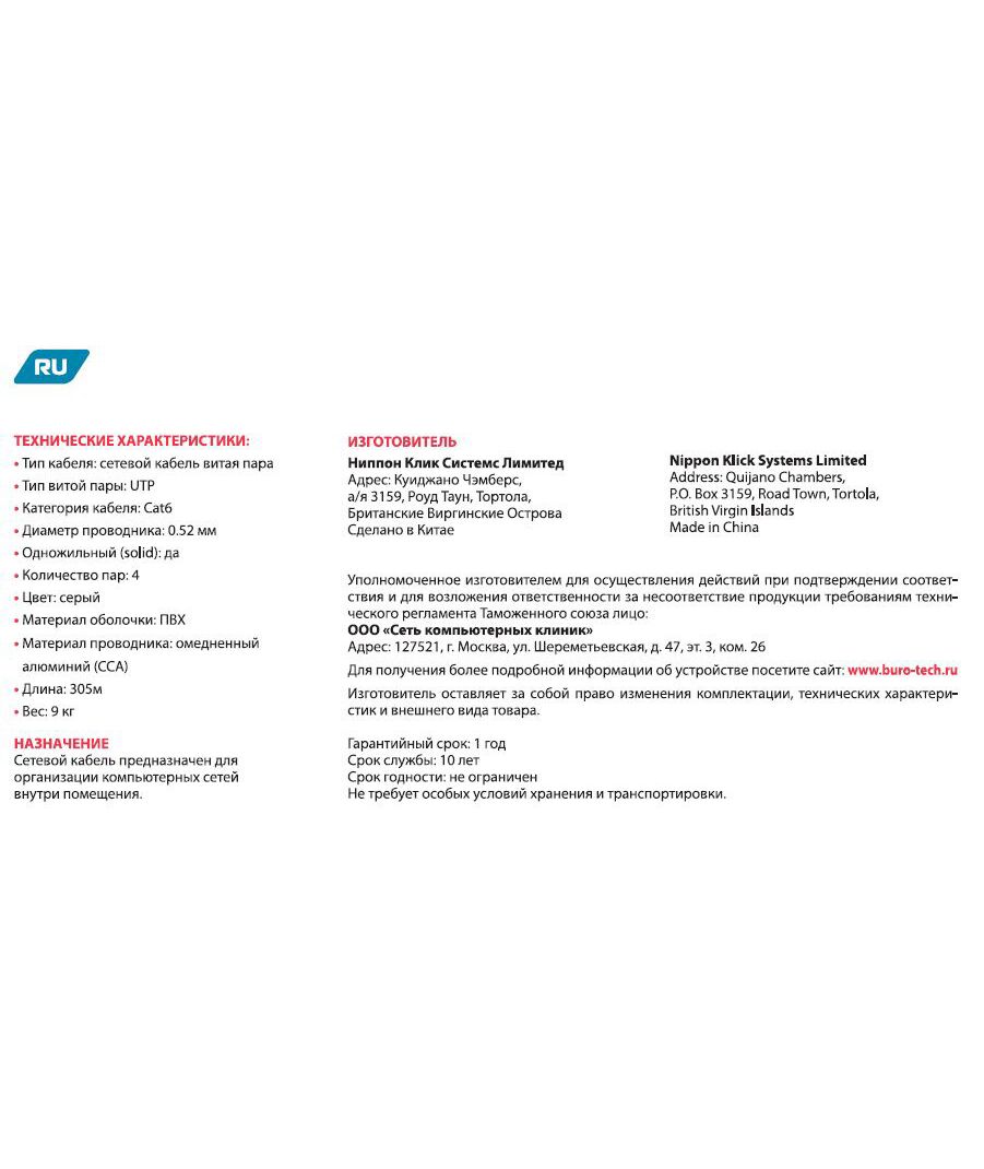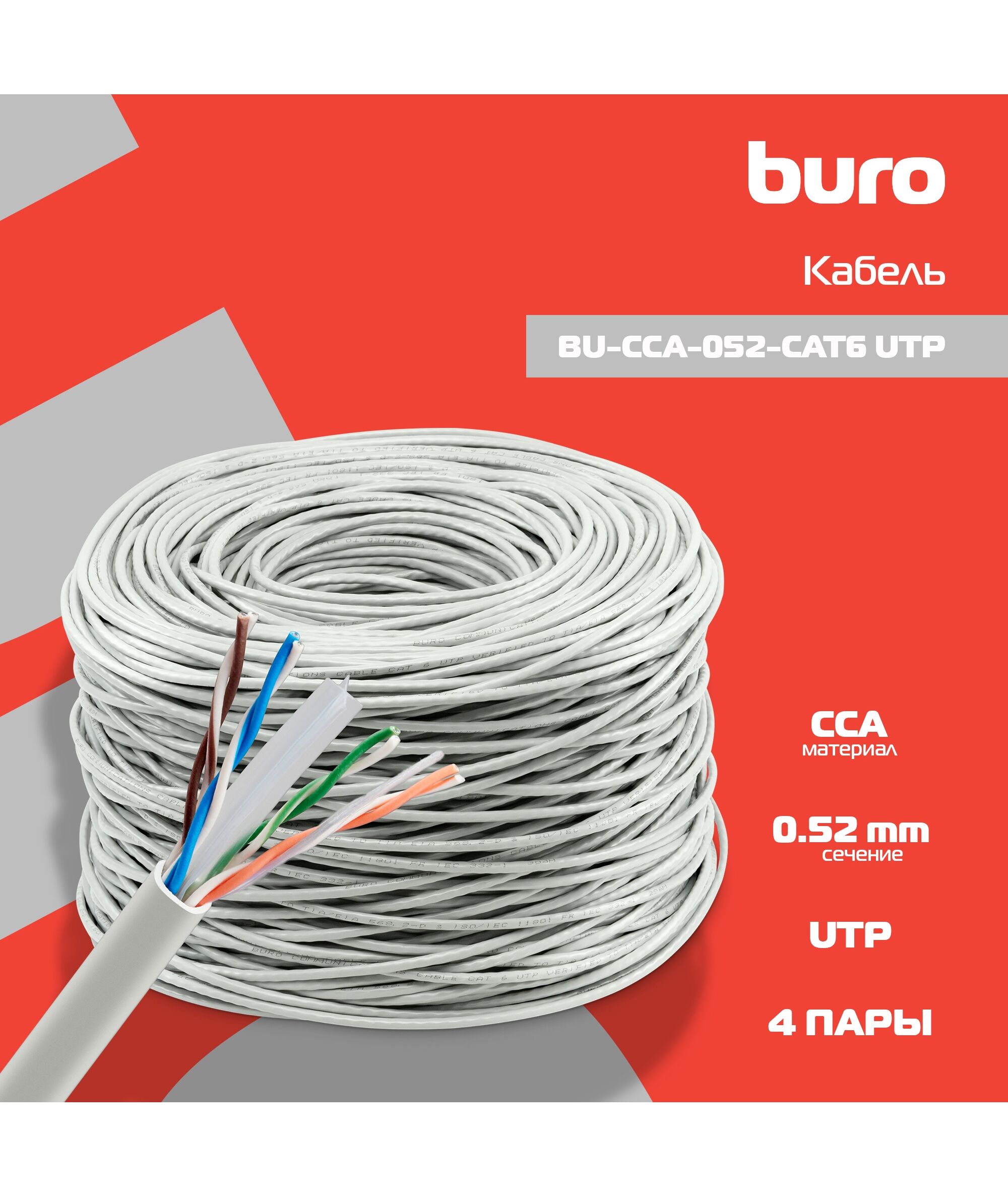 Кабель сетевой BURO BU-CCA-052-CAT6 UTP 4 пары cat.6 solid 0.52мм CCA 305м серый