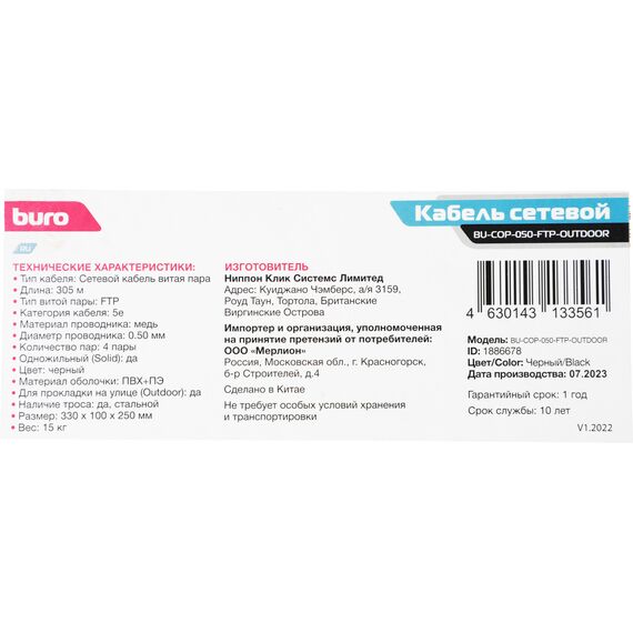 Кабель сетевой BURO BU-COP-050-FTP-OUTDOOR FTP 4 пары cat.5E solid 0.50мм Cu 305м черный outdoor стальной трос