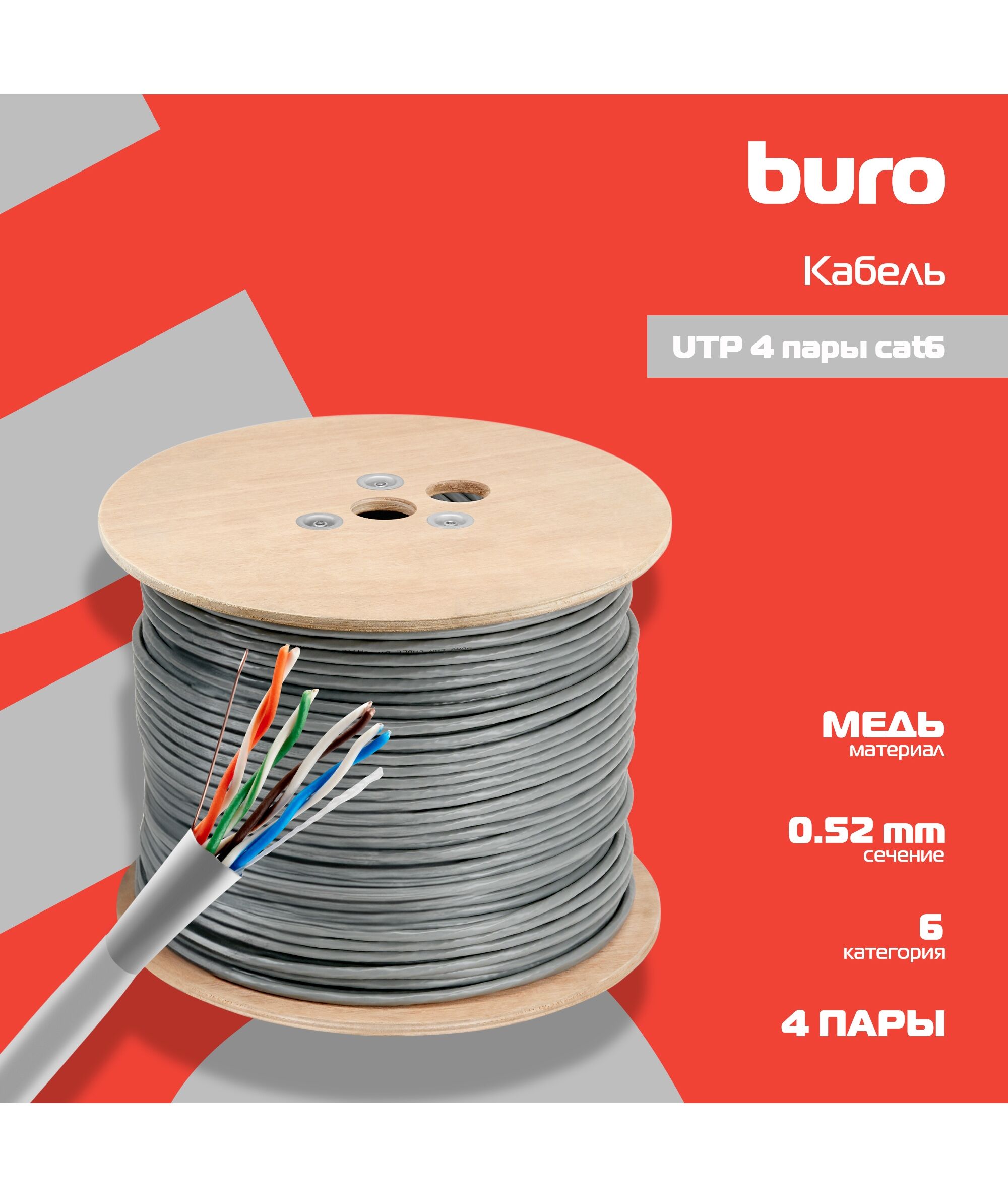Кабель сетевой BURO BU-COP-052 UTP 4 пары cat.6 solid 0.52мм Cu 305м серый