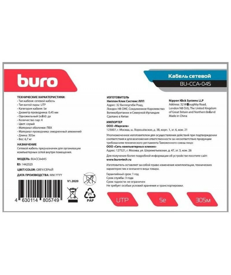 Описание BURO UTP, cat.5E, 305м, 4 пары