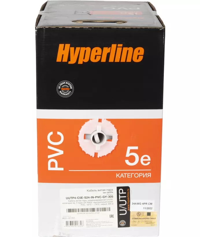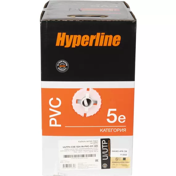 Кабель информационный Hyperline UUTP4R-C5E-S24-IN-PVC-GY-305 кат.5E UTP 4 пары 24AWG PVC внутренний 305м серый