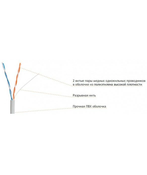 Неэкранированные 2-парные кабели категории 5 предназначены для прокладки внутри помещения. Медные одножильные проводники обеспечивают пропускную способность 100 Мбит/с. Оболочка серого цвета из поливинилхлорида обладает хорошей прочностью на растяжение и изгибы, и высокое сопротивление разрыву. Данные кабели имеют одинаковые характеристики передачи данных, но разную длину: 305 и 500 метров.