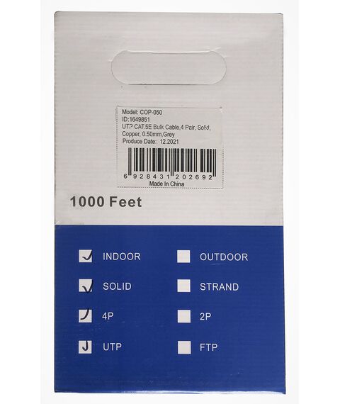 Описание Кабель сетевой NINGBO UTP 4 пары cat.5E solid 0.5мм Cu molded 305м серый