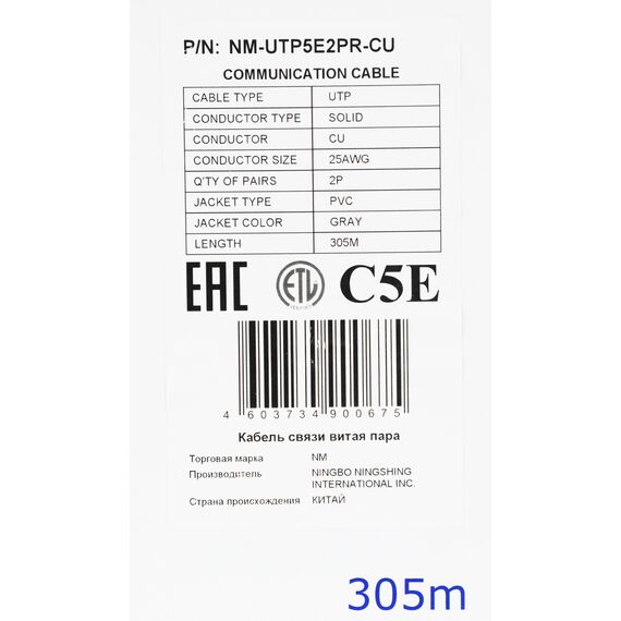 Кабель информационный Lanmaster NM-UTP5E2PR-CU кат.5E UTP 2 пары PVC внутренний 305м серый