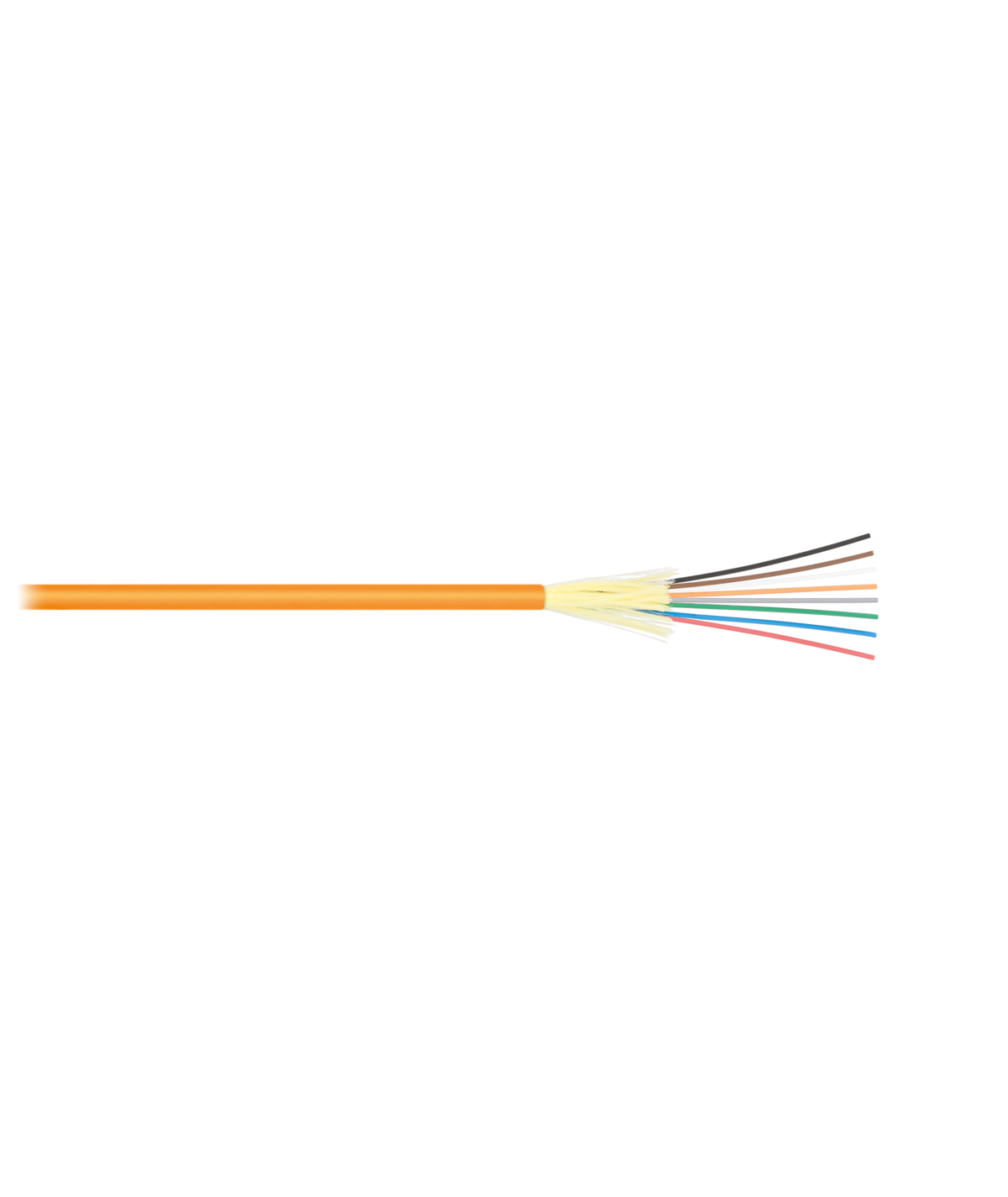 Распределительные оптические кабели, усиленные арамидными нитями, предназначены для прокладки внутри зданий, в кабельных лотках и каналах, трубах и блоках. Используются при построении магистральной кабельной подсистемы здания. Кабели NKL-F-xxxM2I-00C-OR содержат четыре, восемь или шестнадцать оптических волокона в плотном буфере, соответствующих стандарту ISO/IEC 11801 OM2. Поверх волокон накладываются арамидные нити и внешняя оболочка. Оболочка выполнена из нераспространяющего горение, малодымного, с низкой токсичностью продуктов горения, полимерного материала