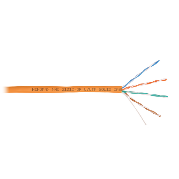 Кабель Nikomax NMC 2100C-OR U/UTP 4 пары, Кат.5e (Класс D), тест по ISO/IEC, 100МГц, одножильный, BC (чистая медь), 24AWG (0,50мм), полимерный материал нг(А)-HF, внутренний, оранжевый, 305м