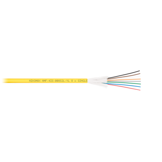 Кабель волоконно-оптический Nikomax NMF-4IS-024S2L-YL-F001 24 волокна, одномодовый 9/125мкм, стандарта OS2, внутренний, распределительный, с плотным буфером, силовой элемент — стеклонити, полимерный материал нг(A)-LSLTx, желтый
