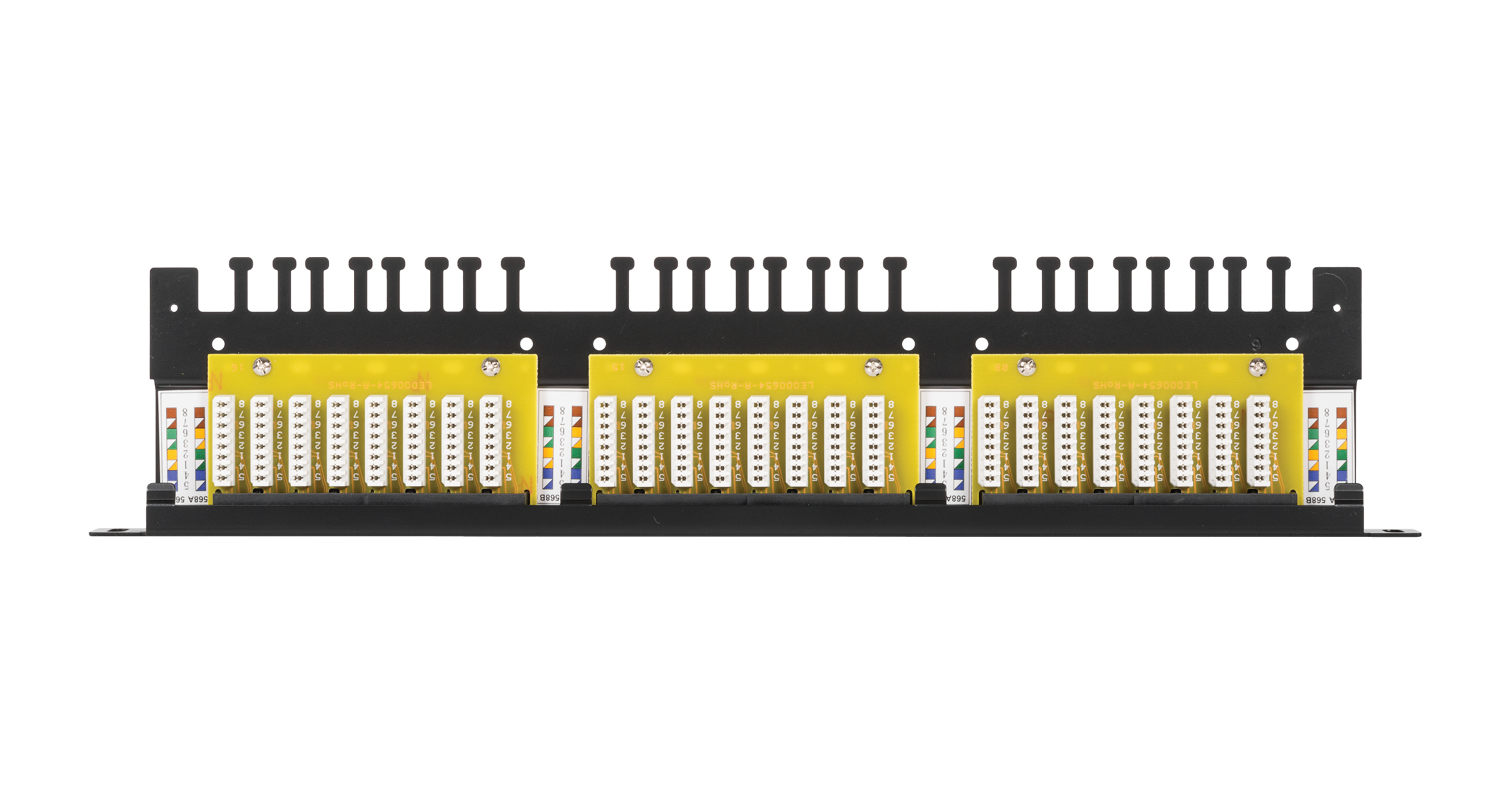 Коммутационные панели (патч-панели) предназначены для монтажа кабелей в различных подсистемах СКС и подключения отдельных составляющих сети друг к другу при помощи коммутационных шнуров. Панели высокой плотности NMC-RP24UE2-HU-BK (кат.6) выполнены в неэкранированных корпусах и предназначены для монтажа в 19” шкафы или стойки. Данные панели вмещают по 24 порта RJ45/8P8C при высоте всего 0,5U. Такое решение идеально, когда необходимо обеспечить высокую плотность портов (например, в дата-центрах) или для расширения сети в ограниченном пространстве шкафа. Универсальные IDC контакты 110/KRONE расположены с тыльной стороны панелей, на горизонтальной подложке. Разводка кабелей на патч-панелях производится по двум стандартам: T568 А и B. Предусмотрен встроенный органайзер для надежного закрепления кабелей.