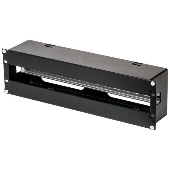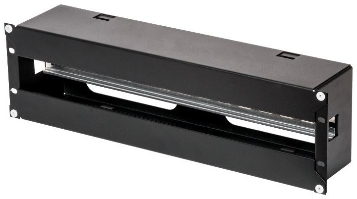 - Панель 19" с DIN-рейкой, 3U состоит из корпуса с установленной в нём DIN-рейкой длиной 443 мм и двух легкосъёмных крышек, установленных сверху и снизу. Корпус на торцах имеет крепёжные отверстия для монтажа панели на 19” направляющих