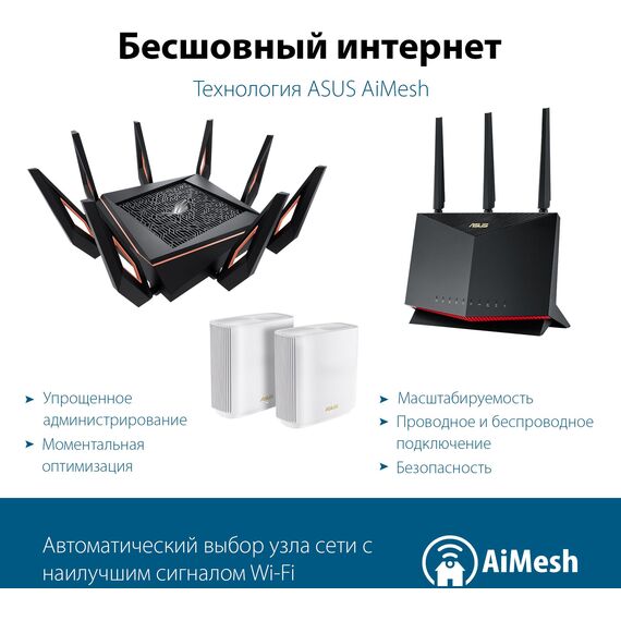 | Особенности | WAN порт стандарта 2.5G Ethernet, геймерская платформа Wtfast, поддержка технологии ячеистых сетей AiMesh, информационная безопасность AiProtection Pro, персональный облачный сервис ASUS AiCloud |