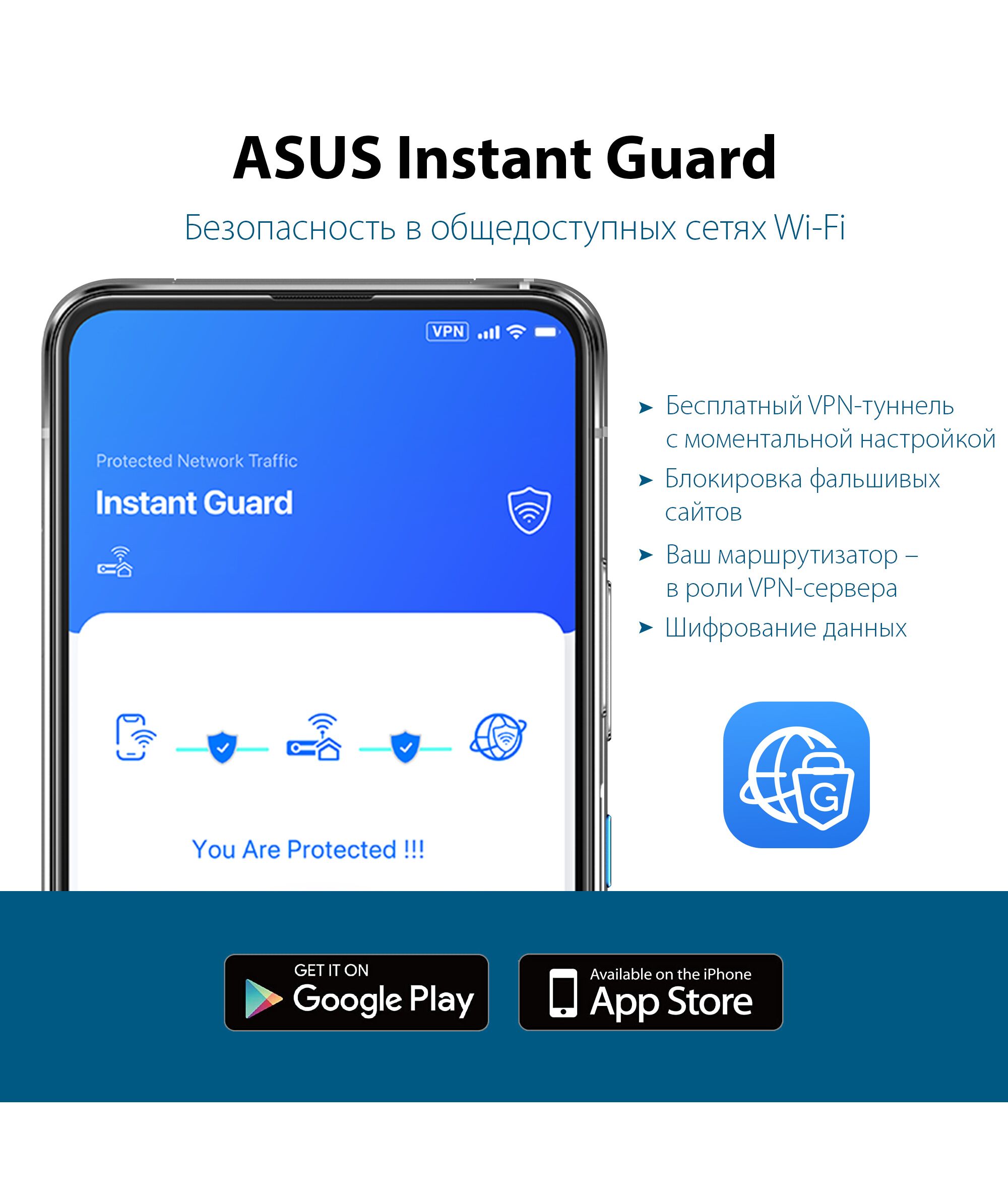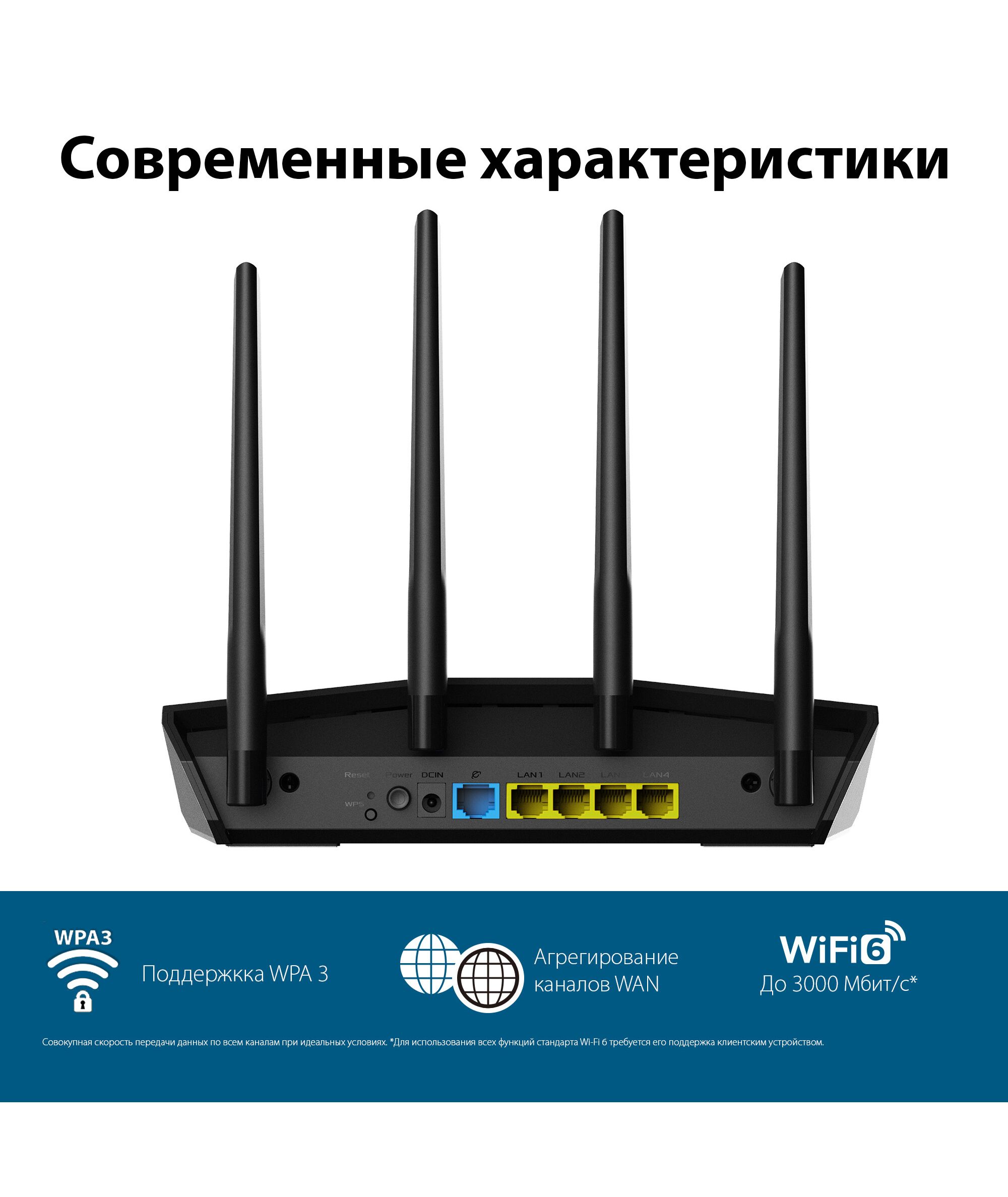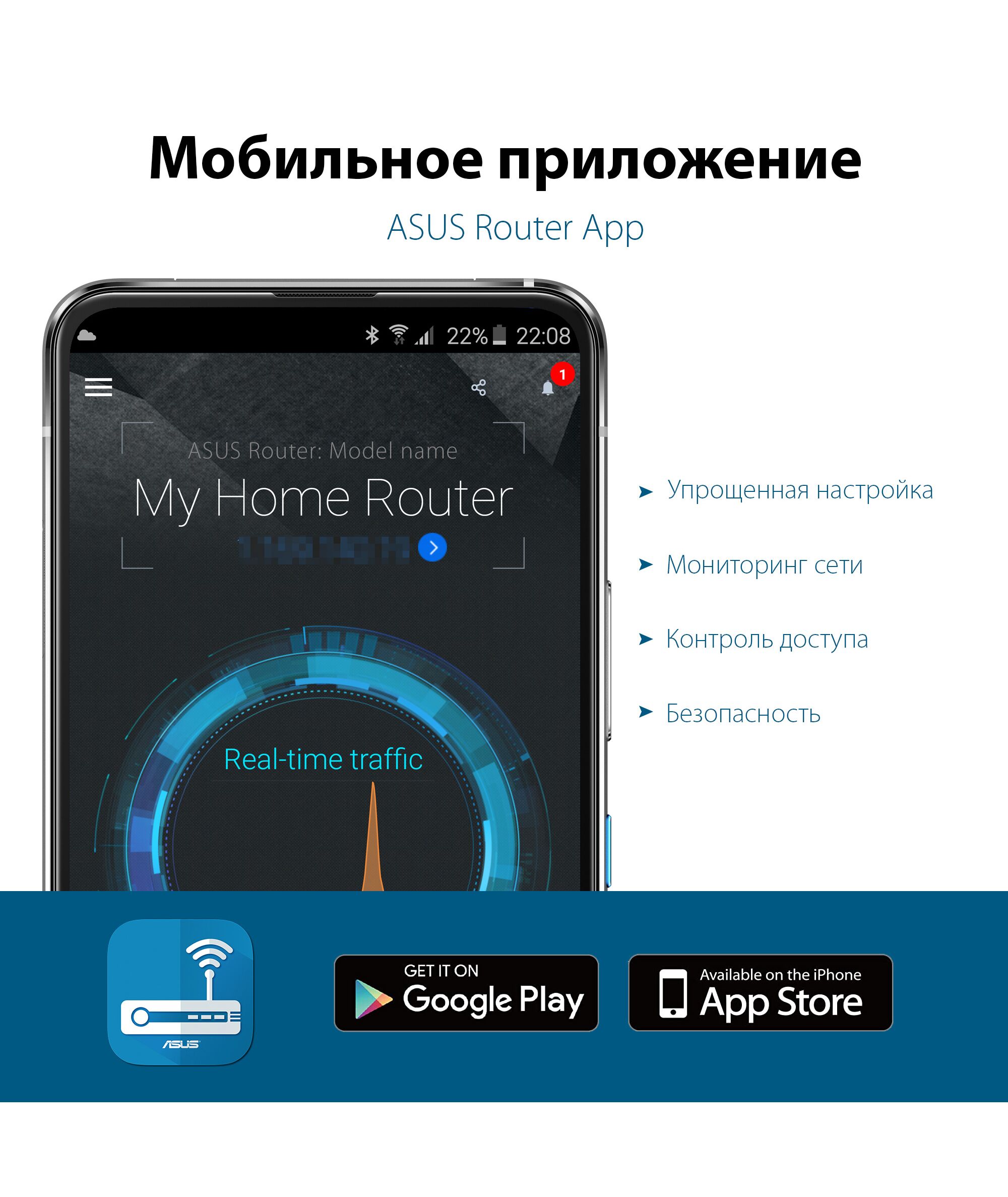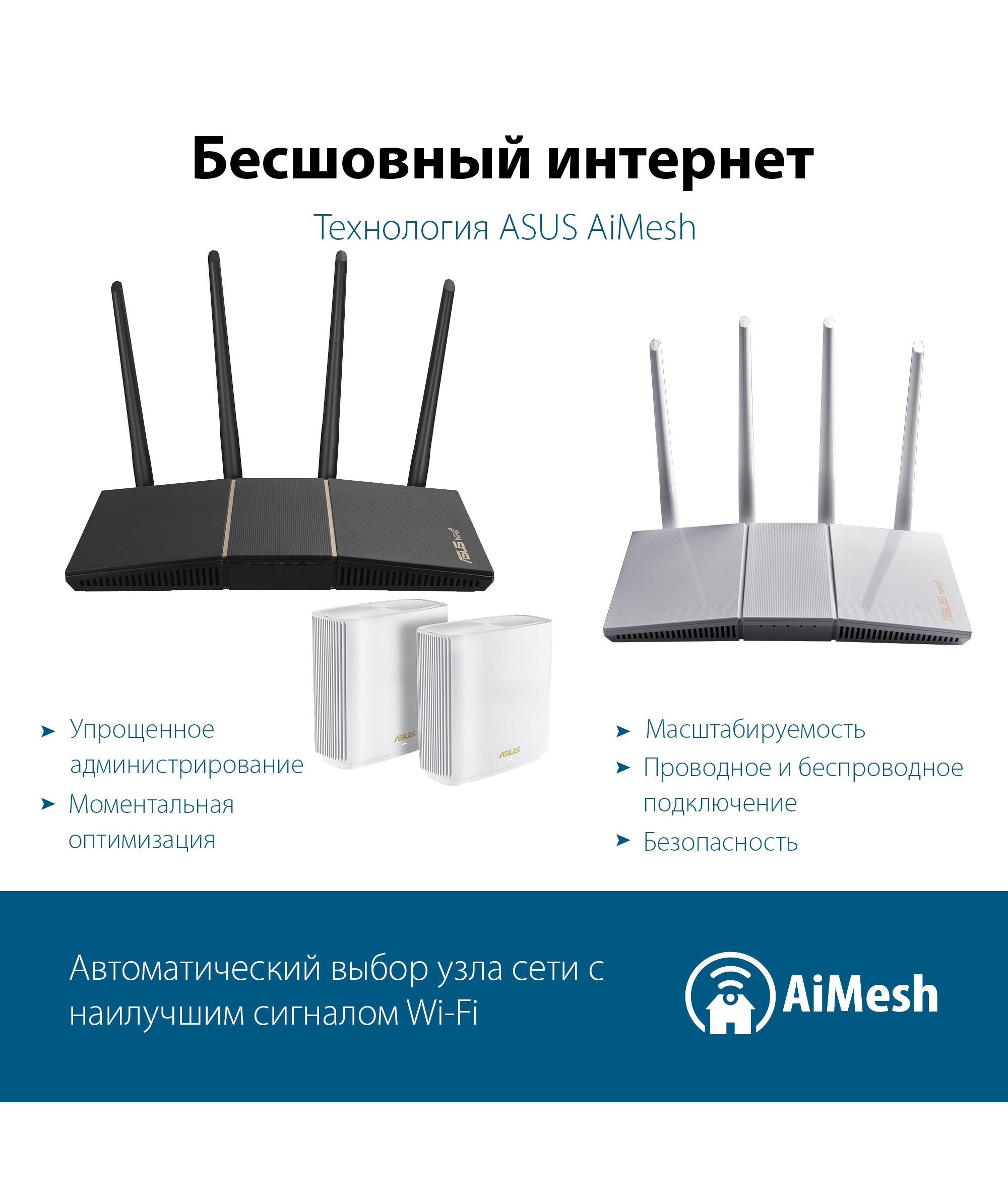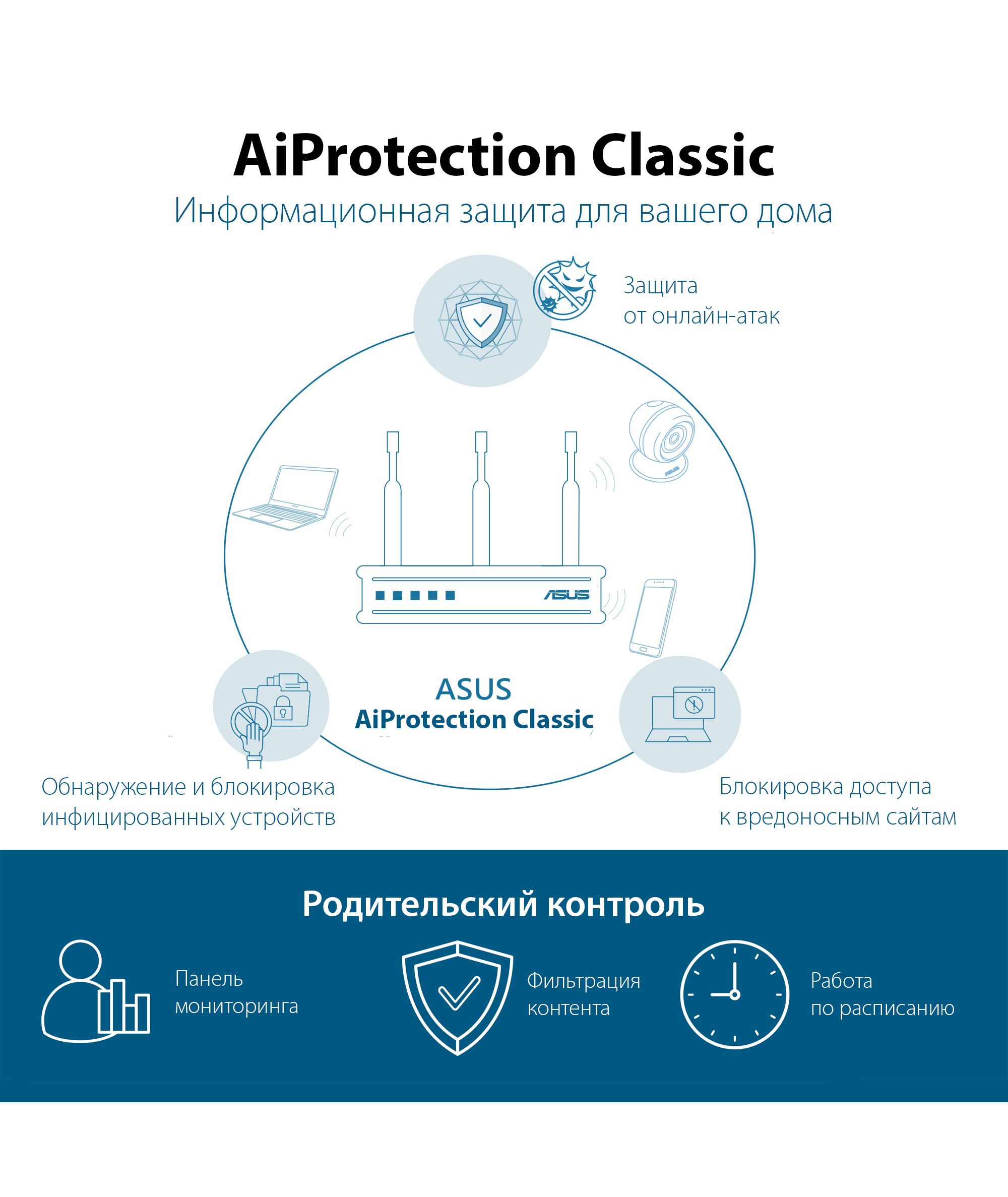 | Преимущества. | Бесплатная система безопасности AiProtection на базе технологий компании Trend Micro.Совместимость с технологией ASUS AiMesh, позволяющей создать ячеистую сеть для охвата больших домов. Технология NitroQAM: модуляция 1024-QAM позволяет увеличить скорость передачи на 25% по сравнению с 256-QAM |