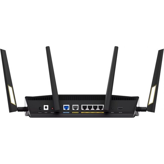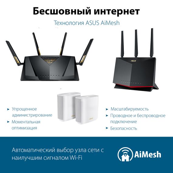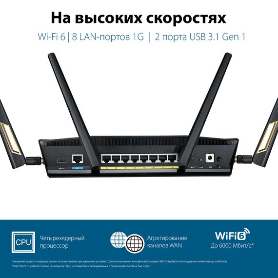 Двухдиапазонный маршрутизатор стандарта Wi-Fi 802.11ax (AX6000) с технологиями MU-MIMO и OFDMA, информационной защитой AiProtection на базе технологий Trend Micro, системой геймерского ускорения WTFast и адаптивным управлением трафиком.