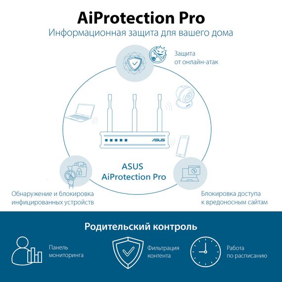 | Преимущества. | Система информационной безопасности AiProtection Pro на базе технологий компании Trend Micro. |