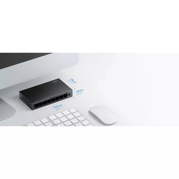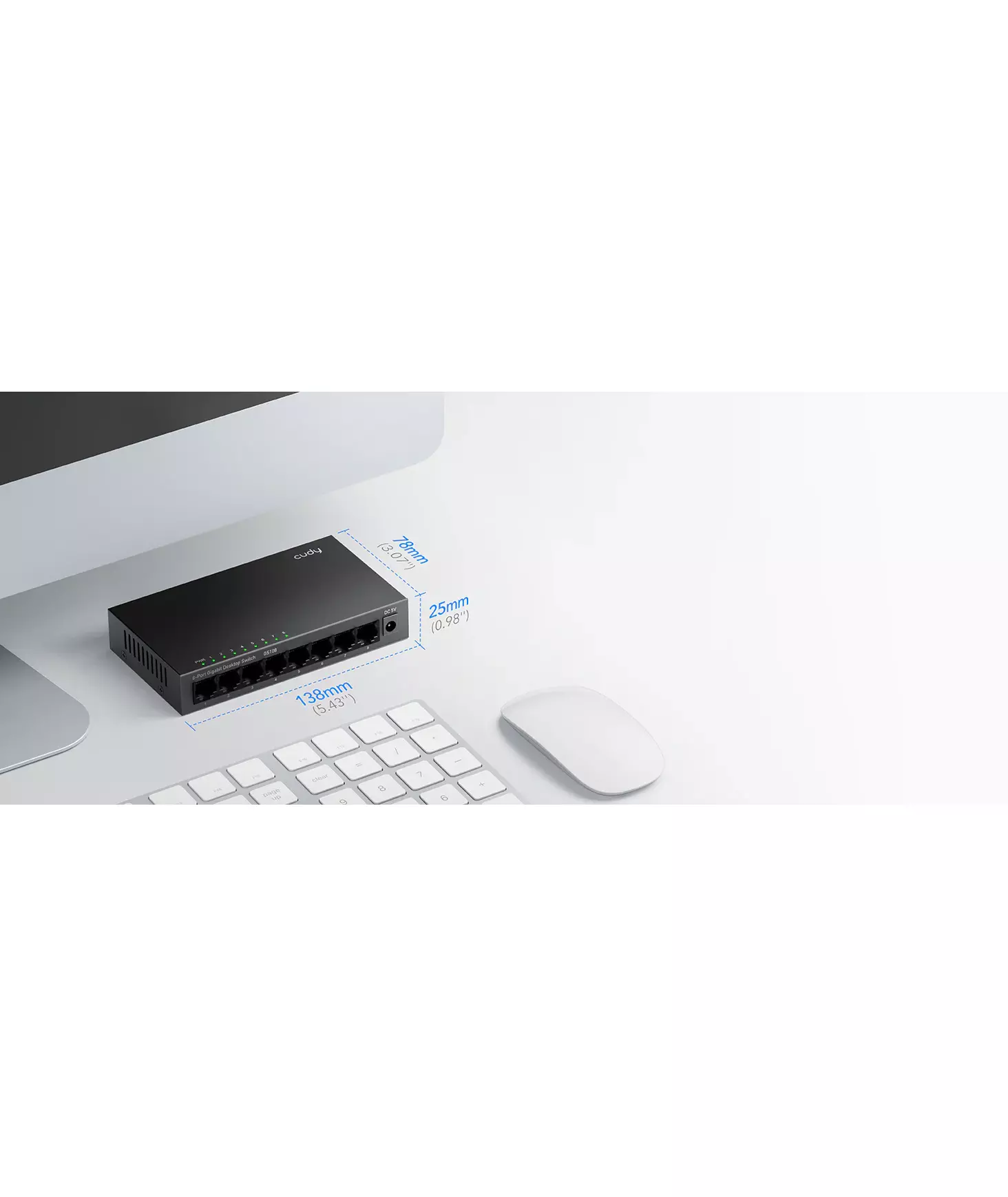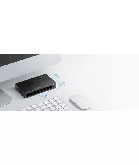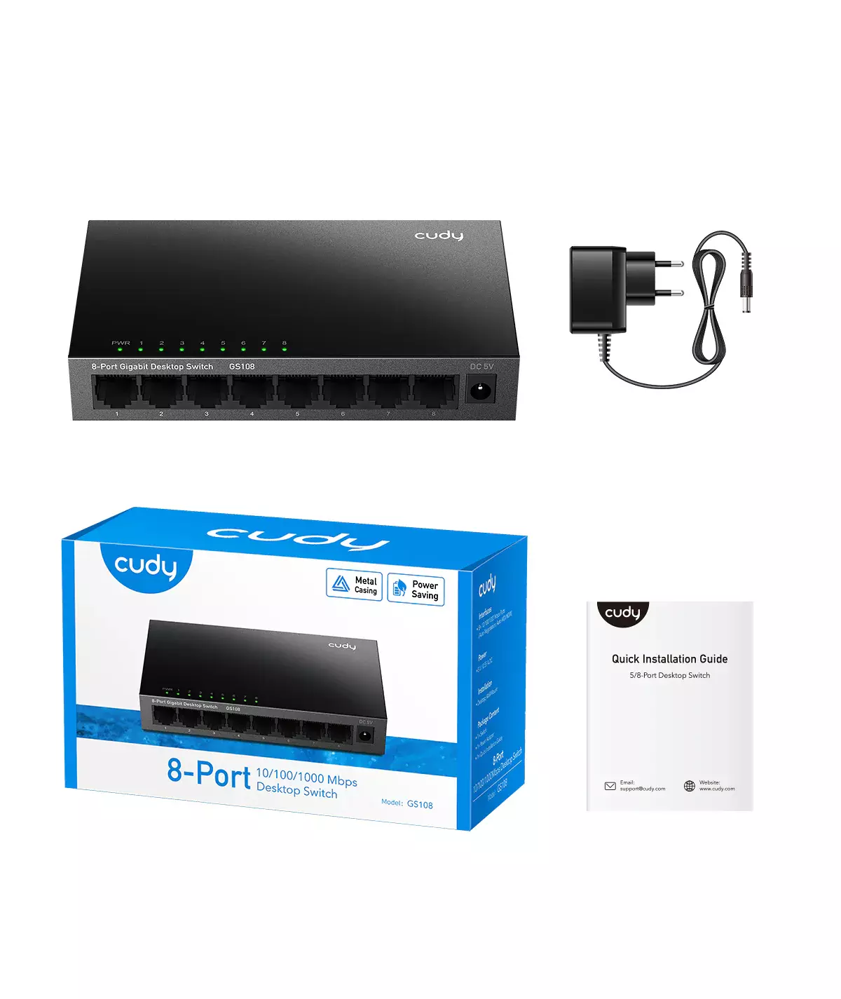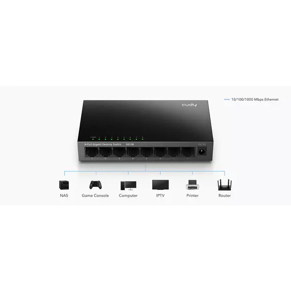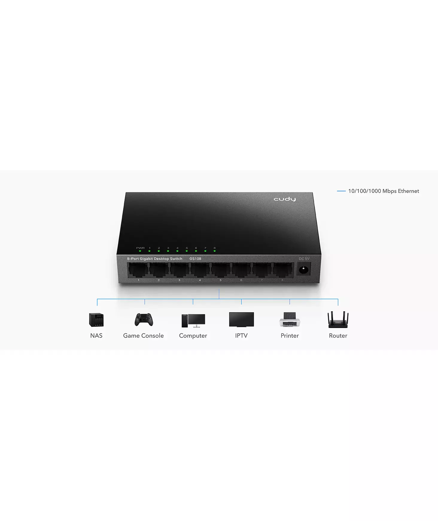 Cudy GS108 оборудован 8 портами с функцией автосогласования, обеспечивающими передачу больших файлов без помех на скорости до 1 Гбит/с. К устройству можно подключить ПК, принтеры, приставки, IP-камеры и датчики умного дома для создания локальной сети. Коммутатор функционирует в режиме store and forward, который позволяет временно хранить данные и проверять их на наличие ошибок. Благодаря неуправляемому типу устройства, его использование упрощается — подключение не требует дополнительных настроек, что делает его удобным для домашнего применения. Энергоэффективные технологии коммутатора автоматически регулируют энергопотребление при простое отдельных линий. Коммутационная таблица поддерживает до 1000 MAC-адресов.