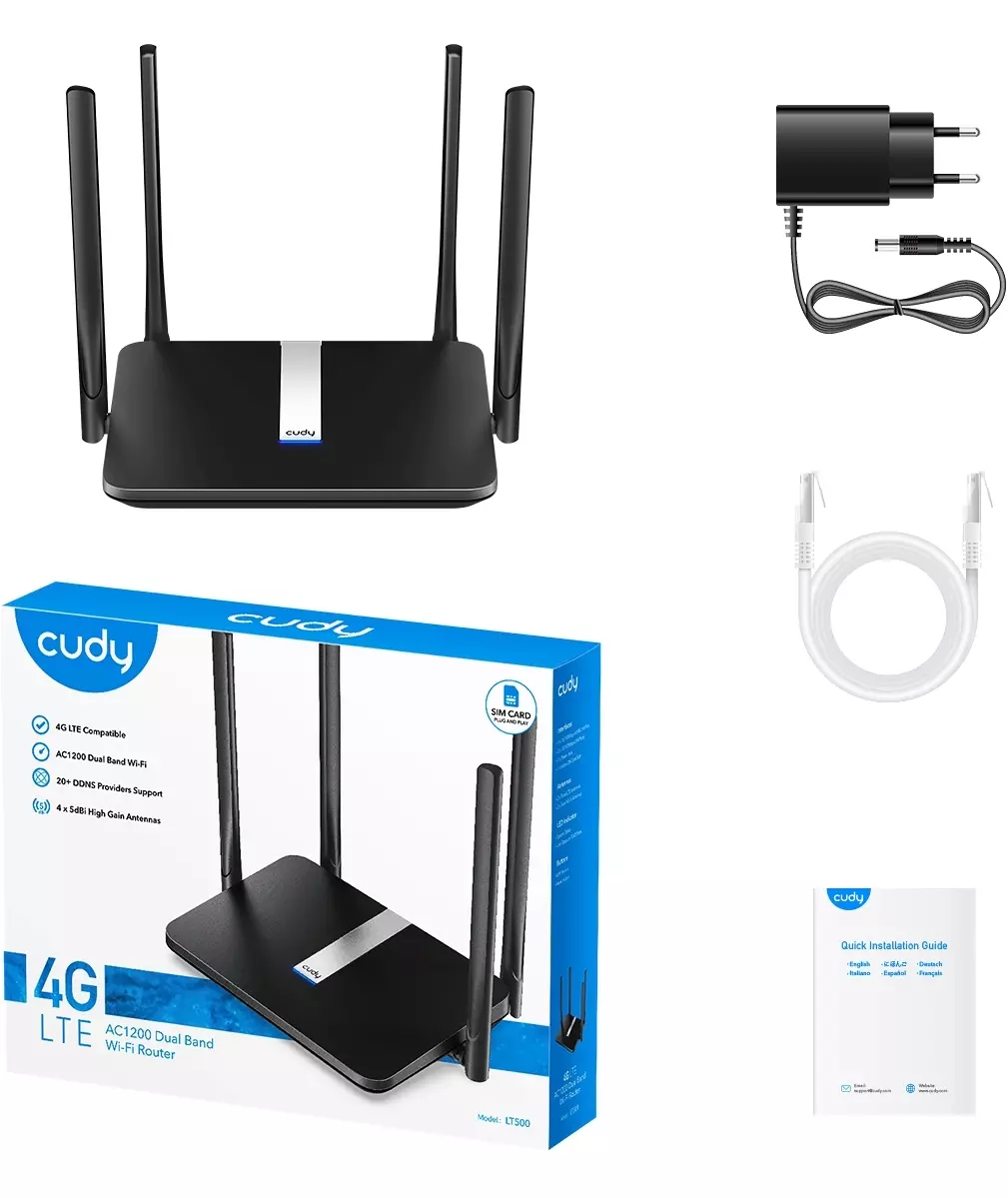 | Комплектация | 4G LTE WiFi роутер, адаптер питания, RJ45 Ethernet кабель, руководство быстрой установки. |