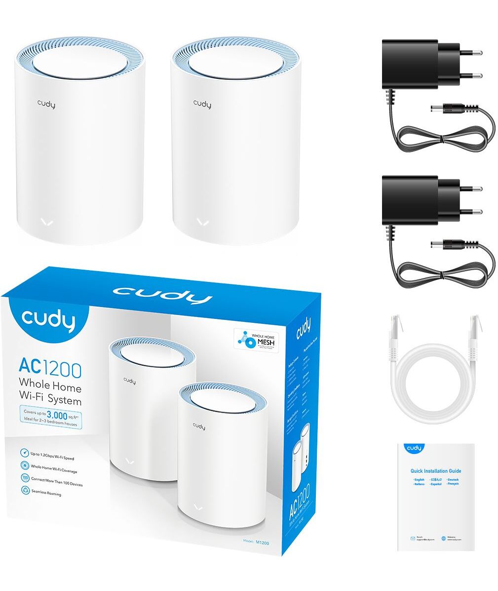 | Комплектация | Роутер Wi-Fi Mesh АС1200 - 2 шт., сетевой адаптер питания от 220В (АС), RJ45 Ethernet-кабель, краткое руководство по установке. |
