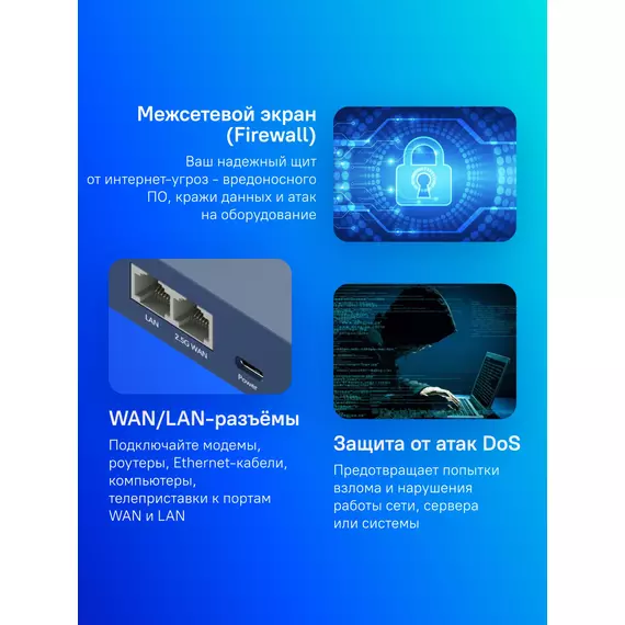 | Средства защиты сети | DMZ, DoS, Firewall, NAT, SPI, гостевая сеть |