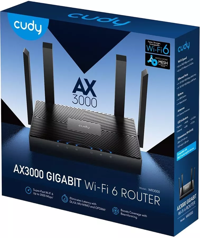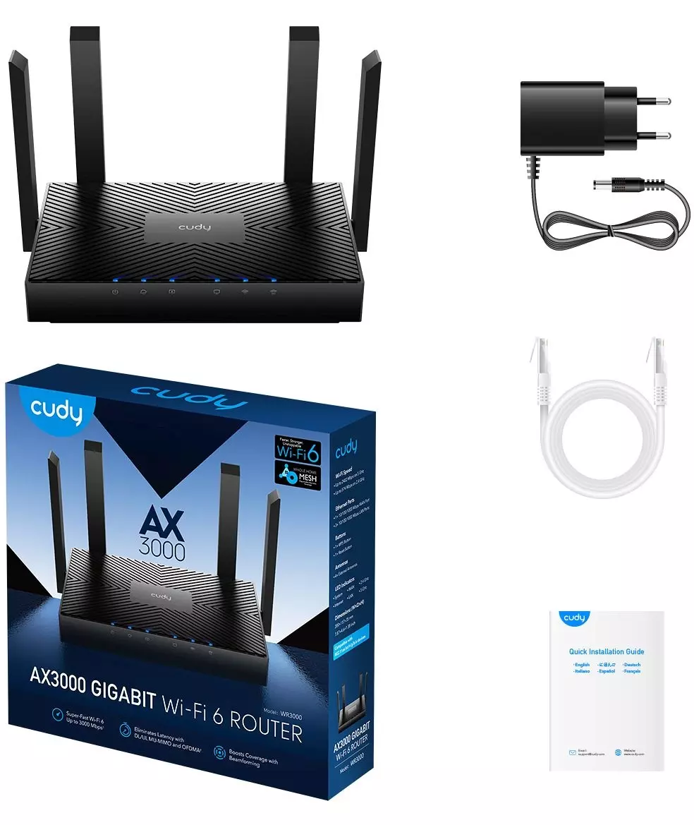 | Комплектация | Маршрутизатор (Wi-Fi 6, AX3000), cетевой адаптер питания от 220В (АС), RJ45 Ethernet-кабель, краткое руководство по установке. |