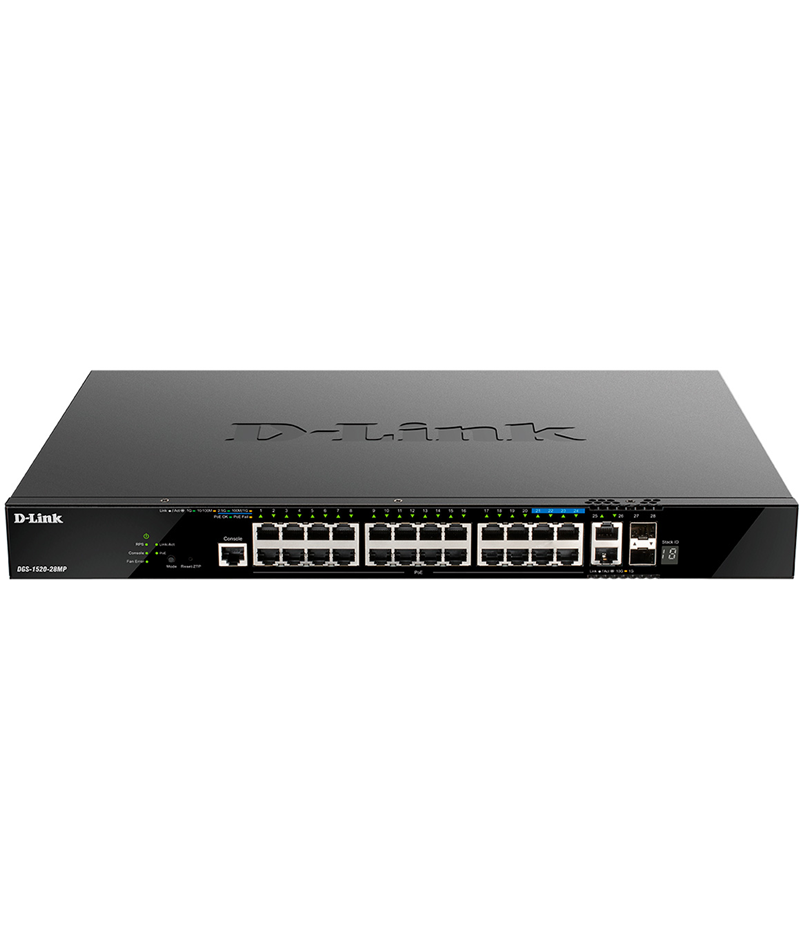 Коммутатор D-link DGS-1520-28MP/A1A Managed L3 Stackable Switch 20x1000Base-T PoE, 4x2.5GBase-T PoE, 2x10GBase-T, 2x10GBase-X SFP+, PoE Budget 370W (740W with DPS-700), CLI, RJ45 Console, RPS