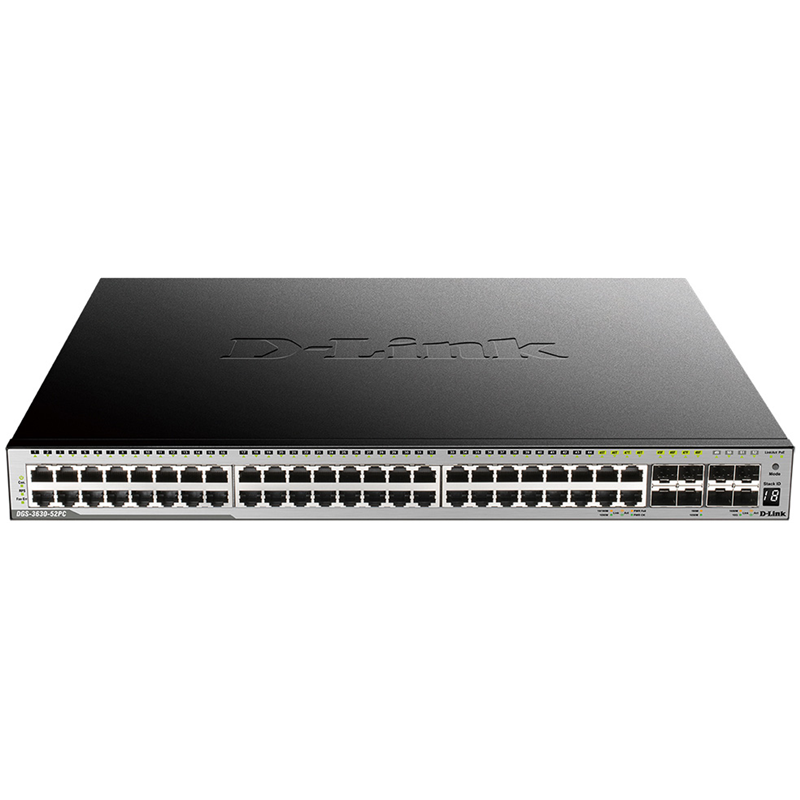 Коммутатор D-link DGS-3630-52PC/A2ASI Managed L3 Stackable Switch 44x1000Base-T PoE, 4x10GBase-X SFP+, 4xCombo 1000Base-T PoE/SFP, PoE Budget 370W (740W with DPS-700), Surge 6KV, CLI, 1000Base-T Management, RJ45 Console, mini-USB Console, USB, RPS, Alarm