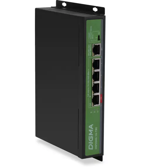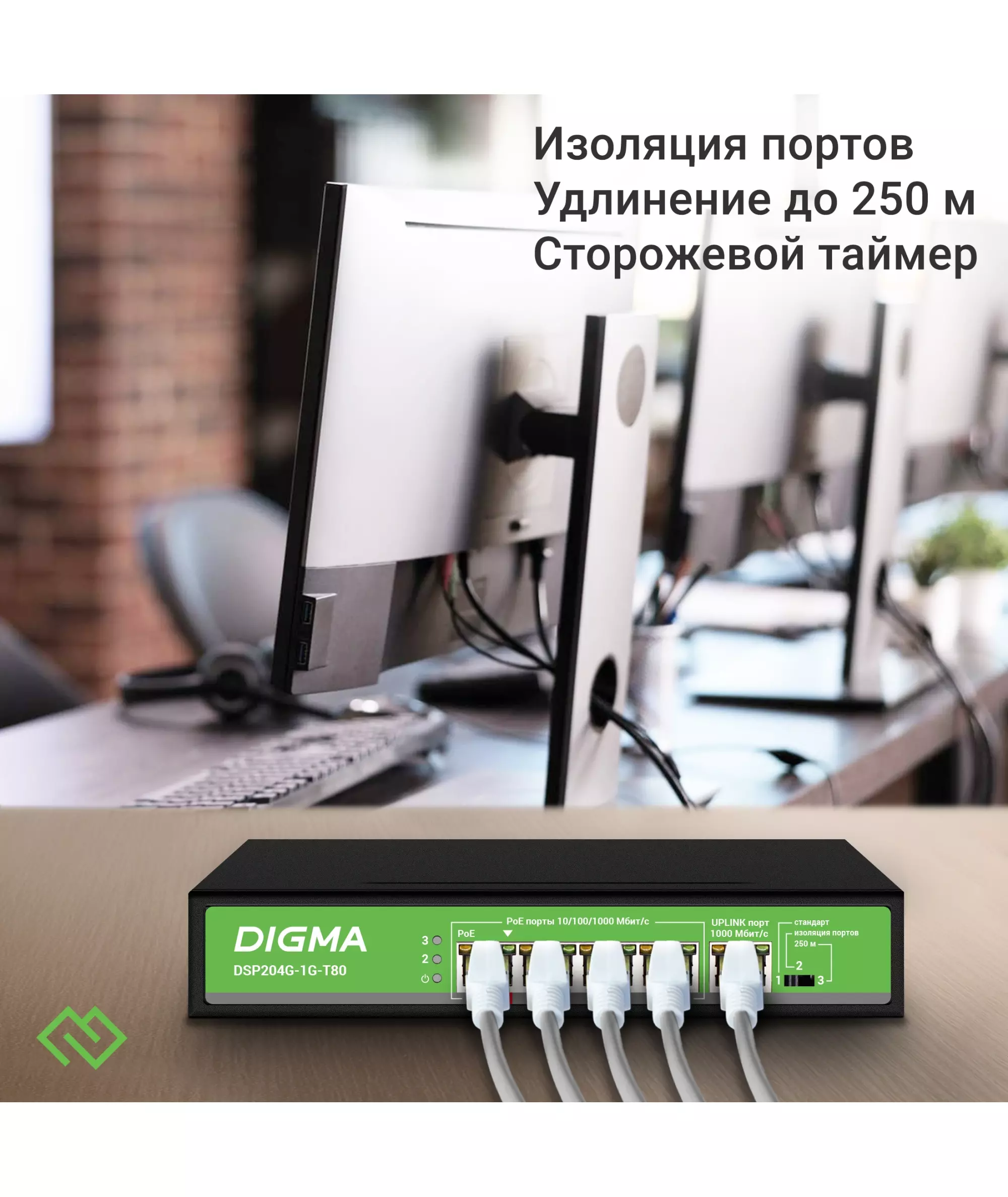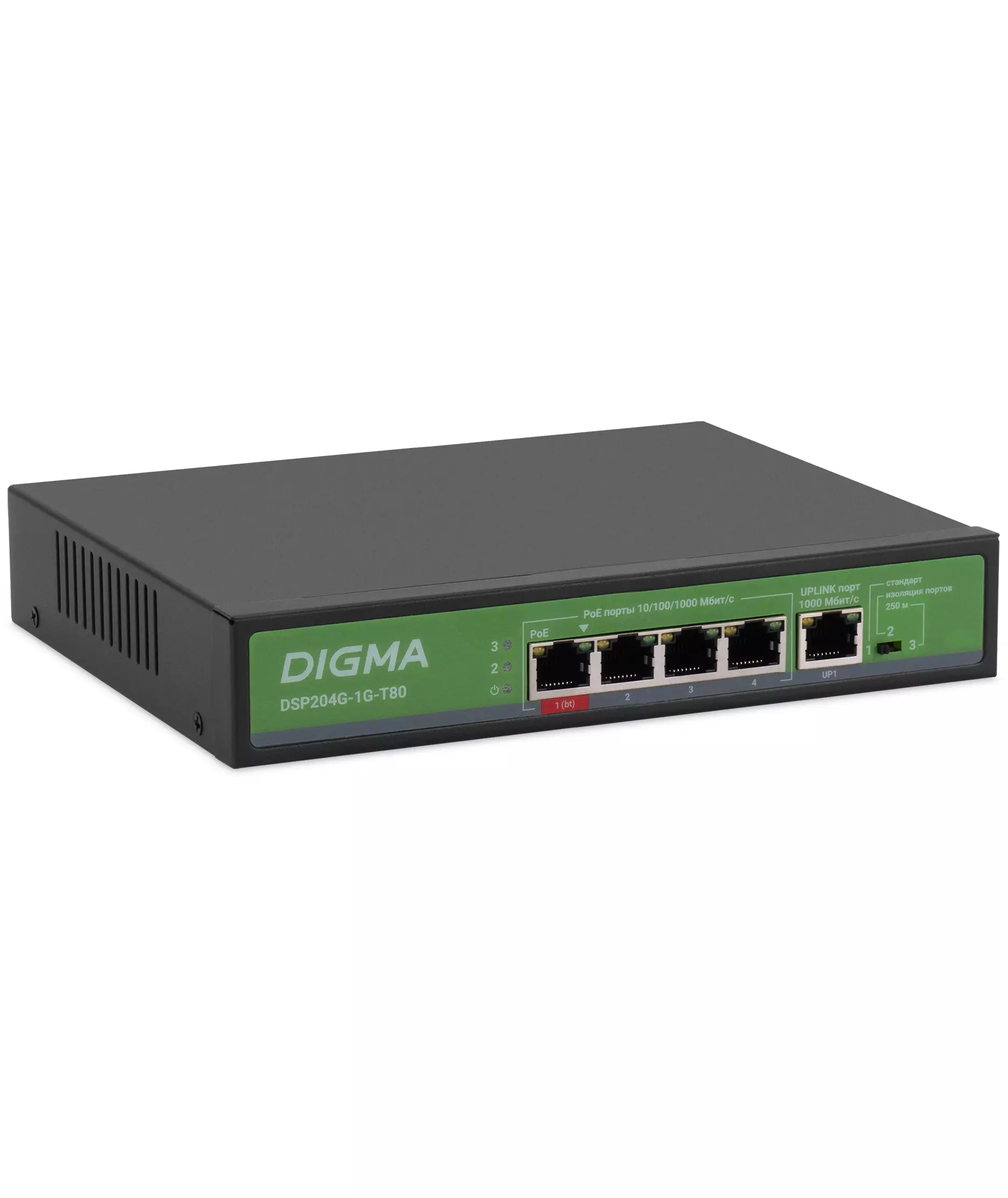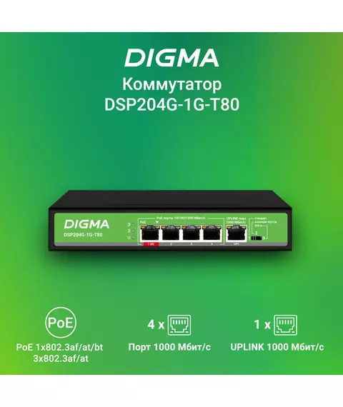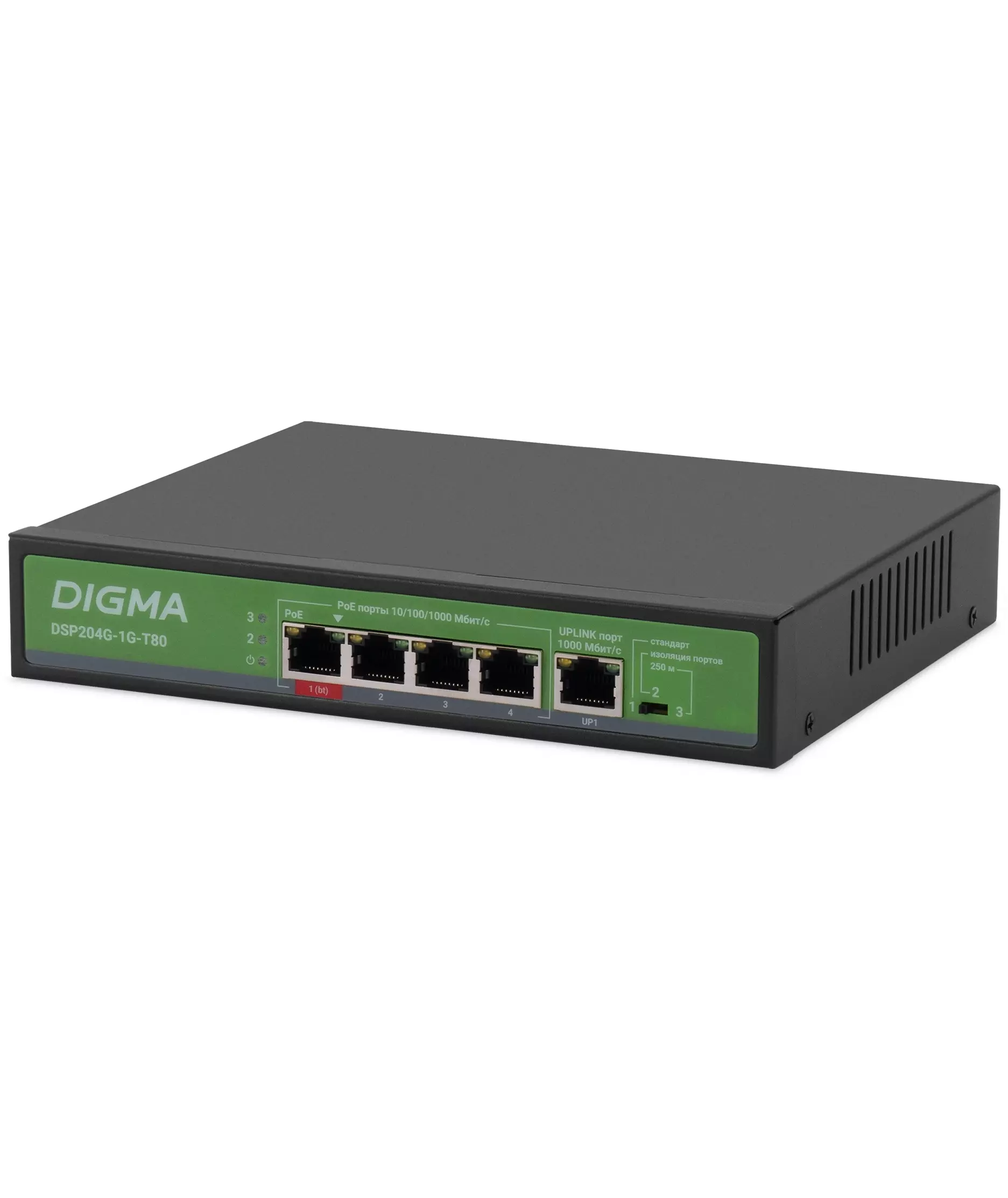 Коммутатор Digma DSP204G-1G-T80 (L2) 5x1Гбит/с 4PoE 4PoE+ 1PoE++ 80W неуправляемый