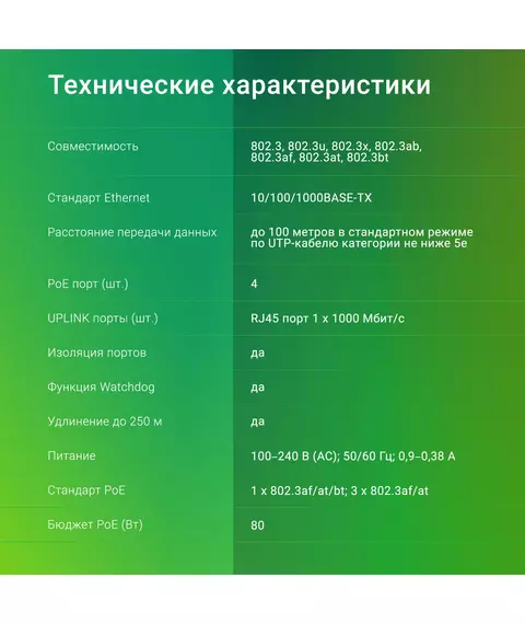 | Особенности2 | Поддерживаются функции: изоляция портов, расширение до 250 метров, сторожевой таймер |