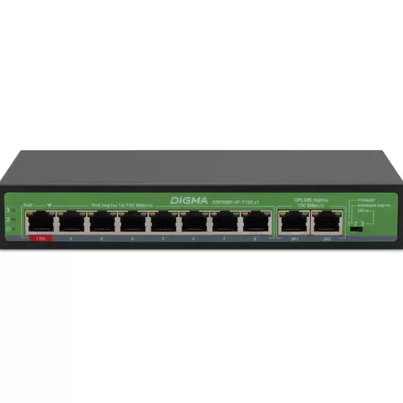 Коммутатор Digma DSP208F-2F-T120 V1 (L2) 10x100Мбит/с 8PoE 8PoE+ 120W неуправляемый