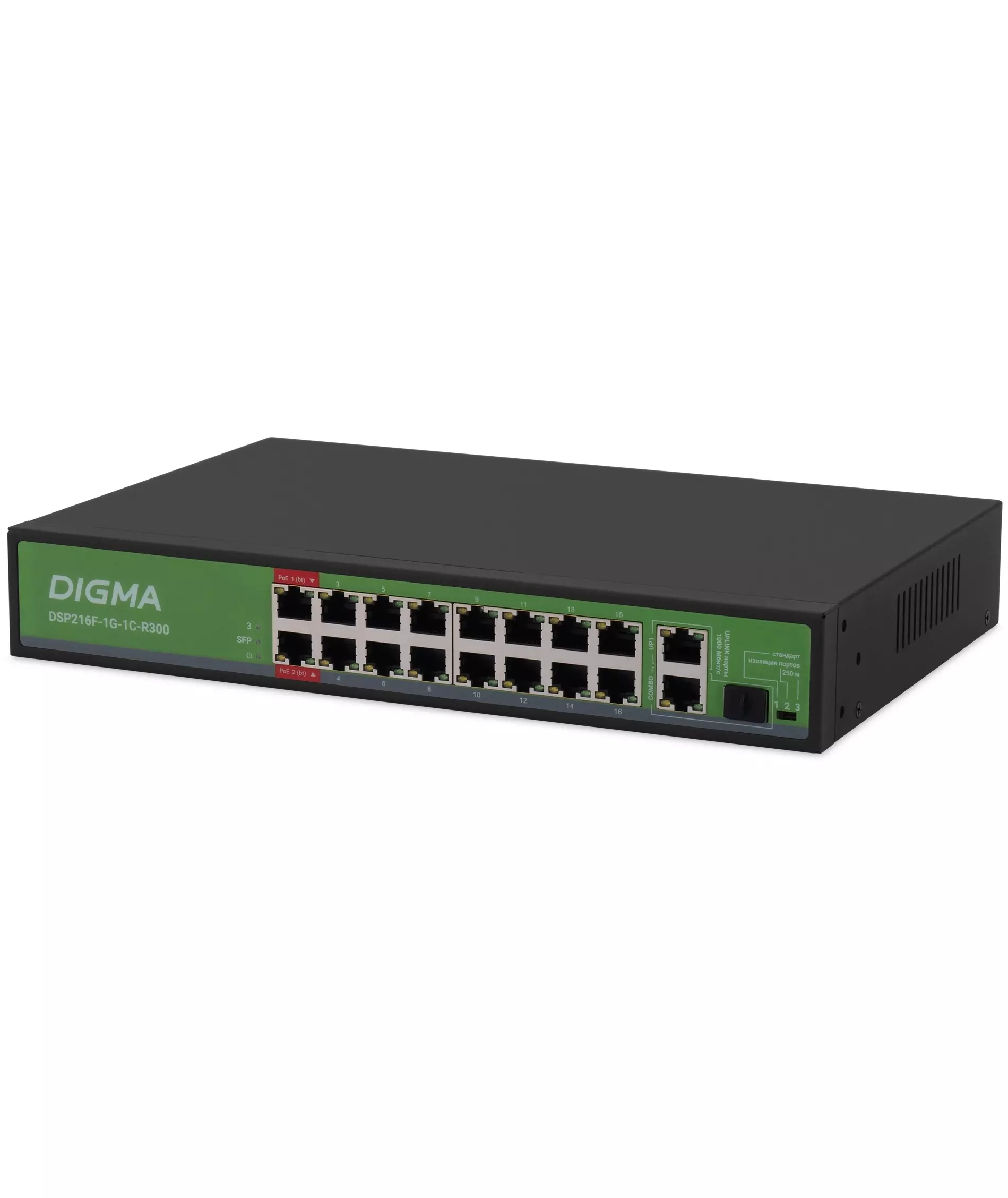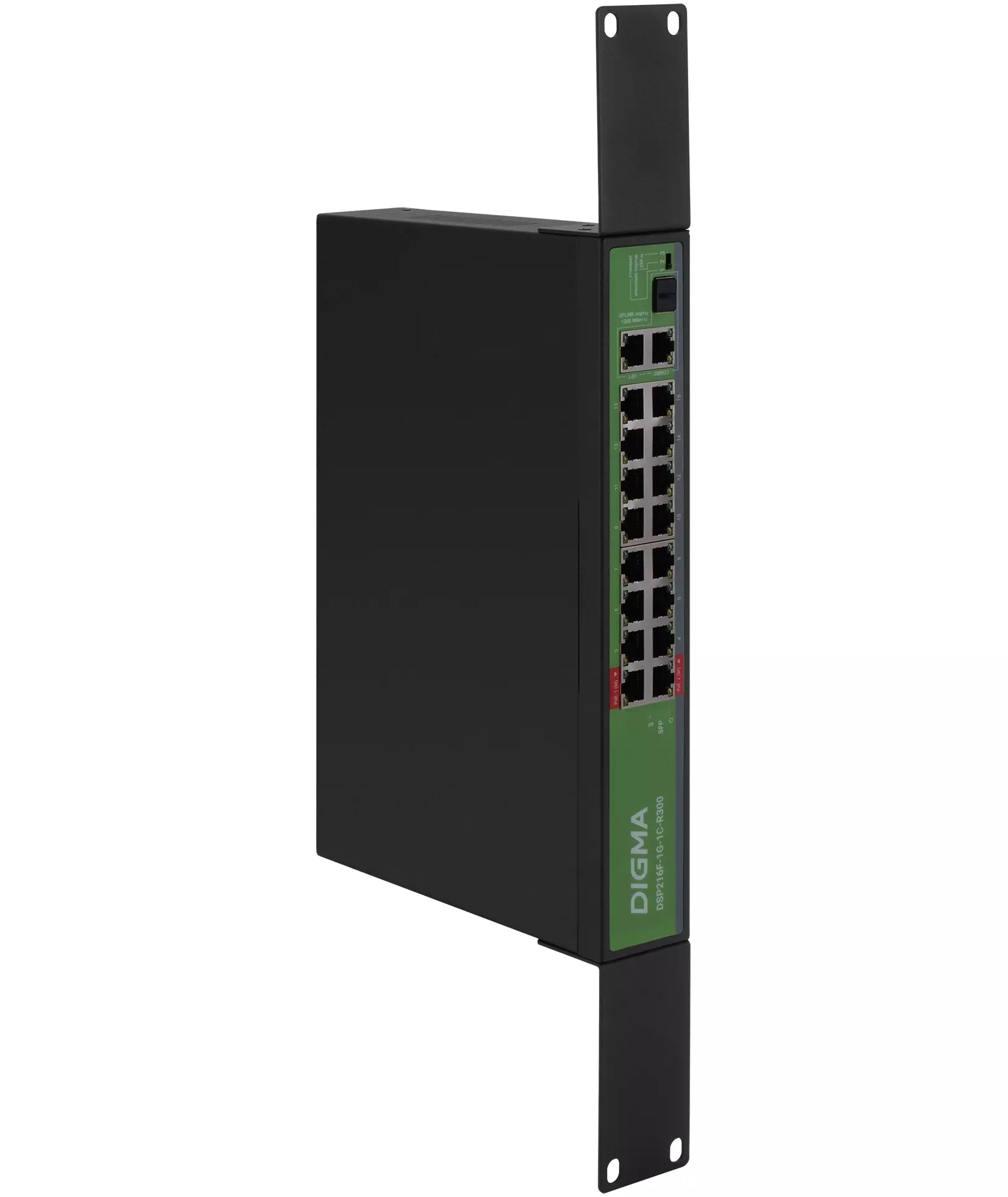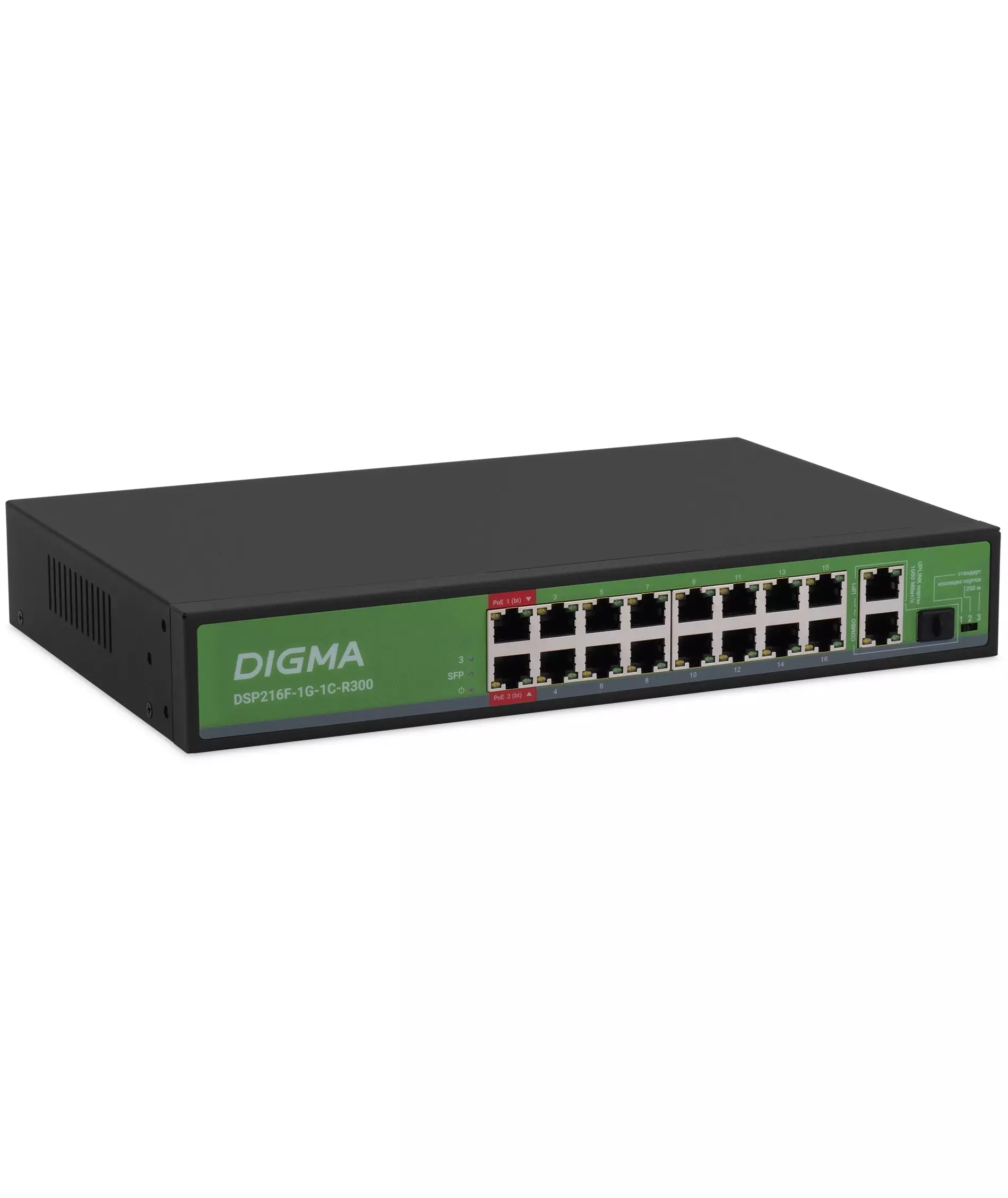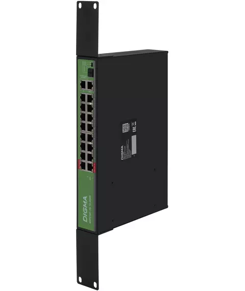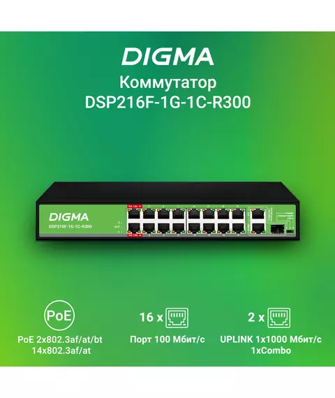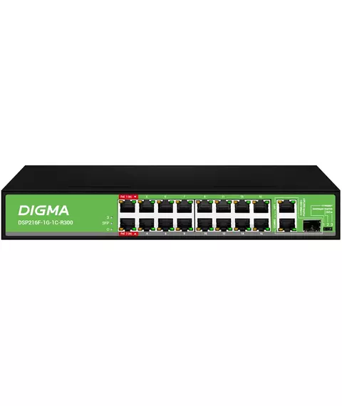 Коммутатор Digma DSP216F-1G-1C-R300 (L2) 16x100Мбит/с 1x1Гбит/с 1xКомбо(1000BASE-T/SFP) 16PoE 16PoE+ 2PoE++ 300W неуправляемый