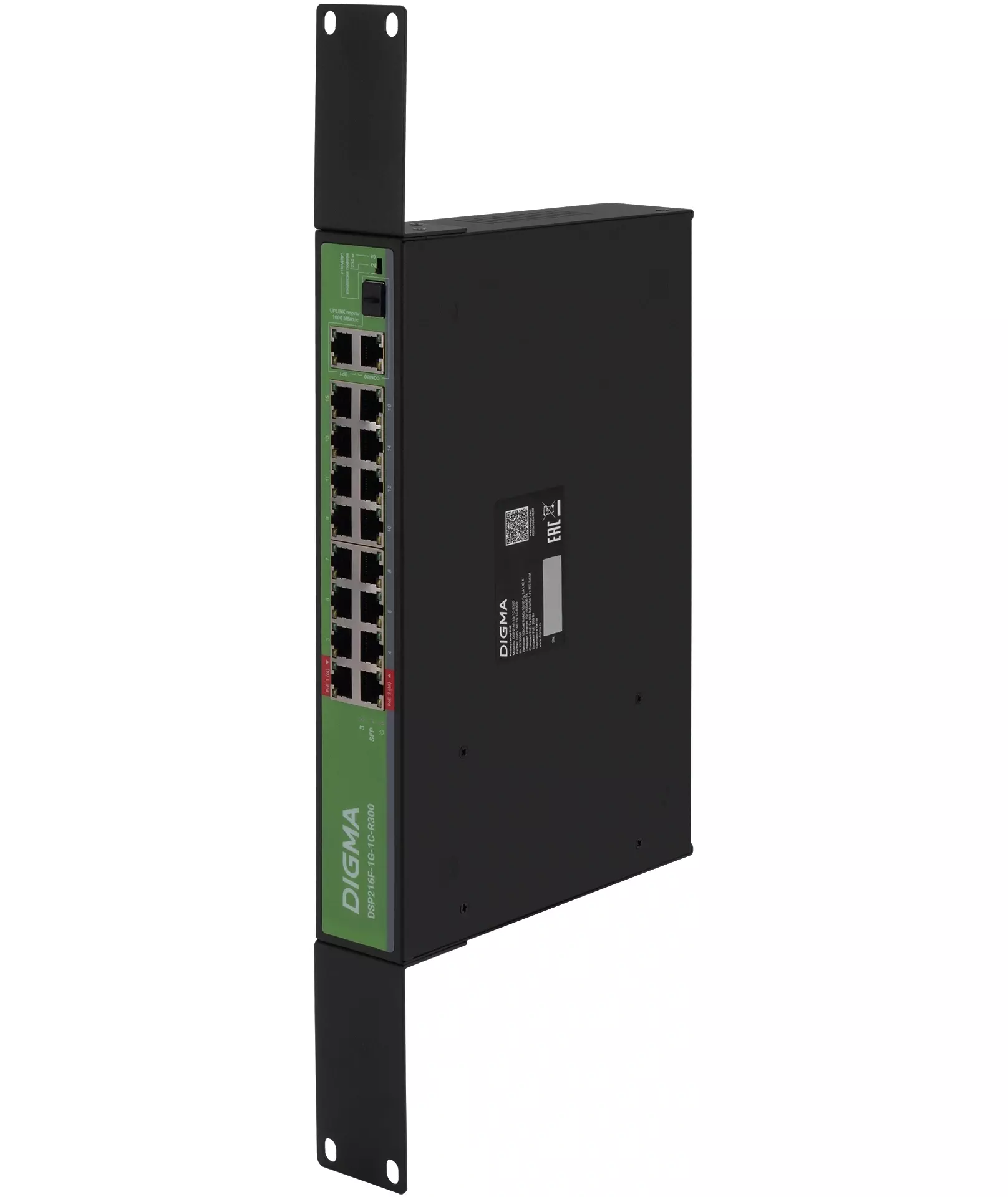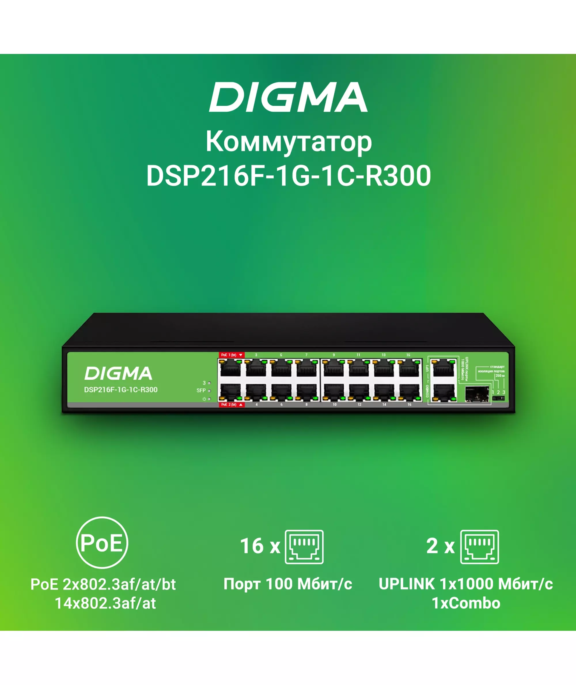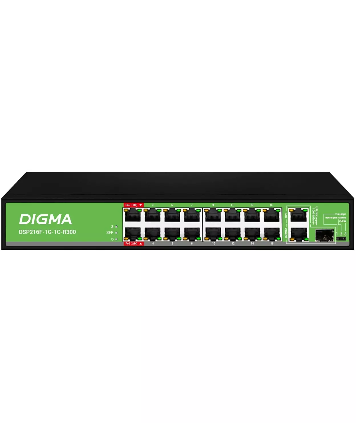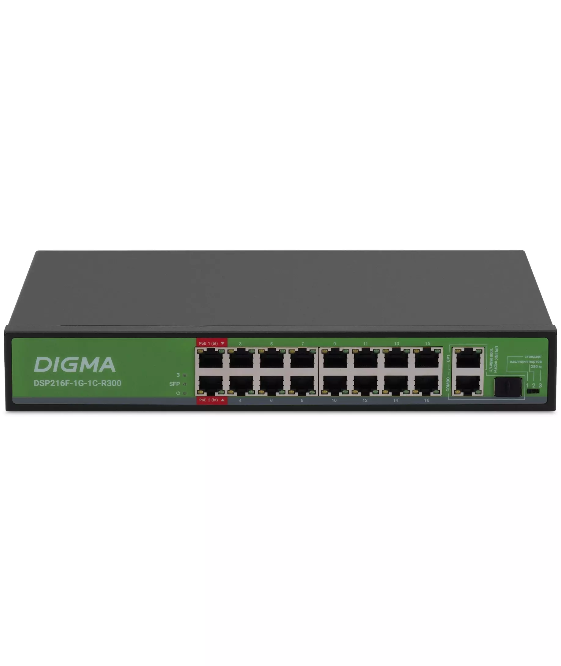 Коммутатор Digma DSP216F-1G-1C-R300 (L2) 16x100Мбит/с 1x1Гбит/с 1xКомбо(1000BASE-T/SFP) 16PoE 16PoE+ 2PoE++ 300W неуправляемый