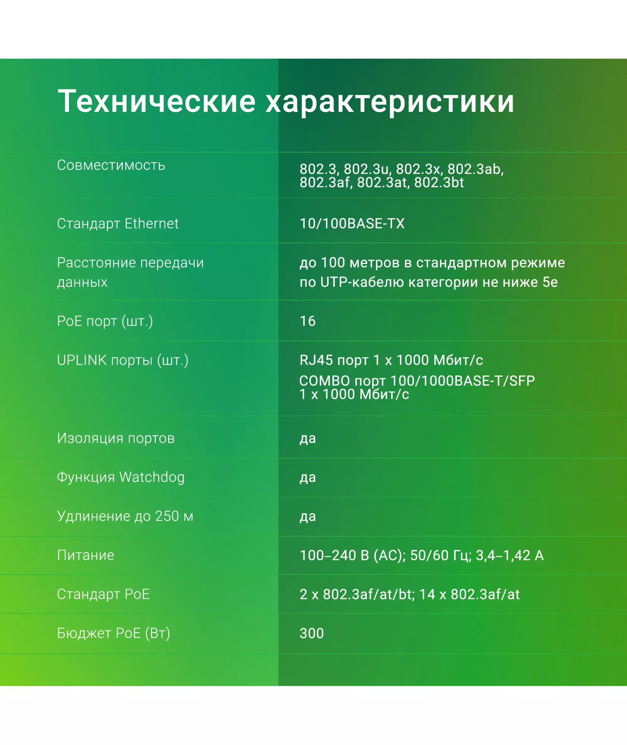 | PoE бюджет | 300 Вт |