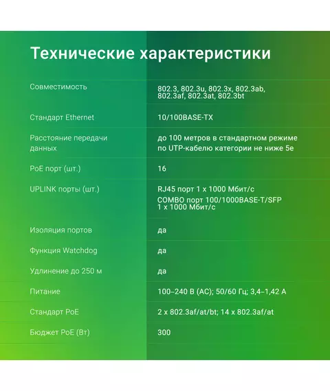 | Особенности | 1,2 порт подерживает питание стандарта 802.3af/at/bt (до 90Вт), 3-16 порт поддерживают питание стандарта 802.3af/at, выводы питания 1/2+,3/6- |
