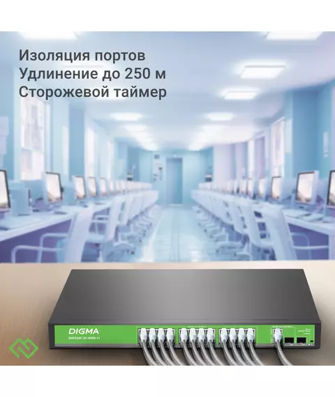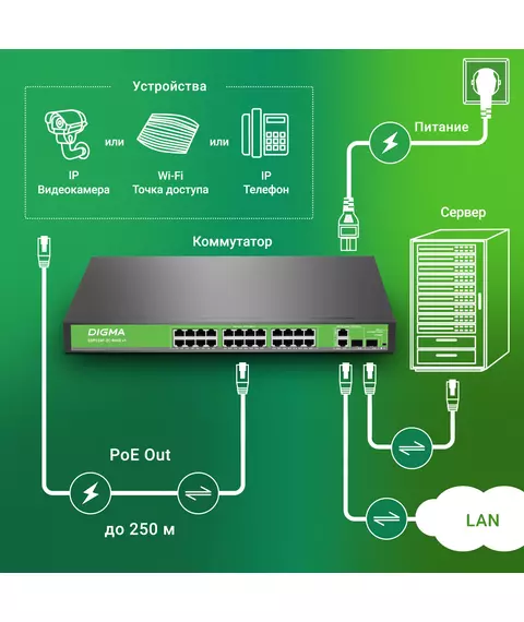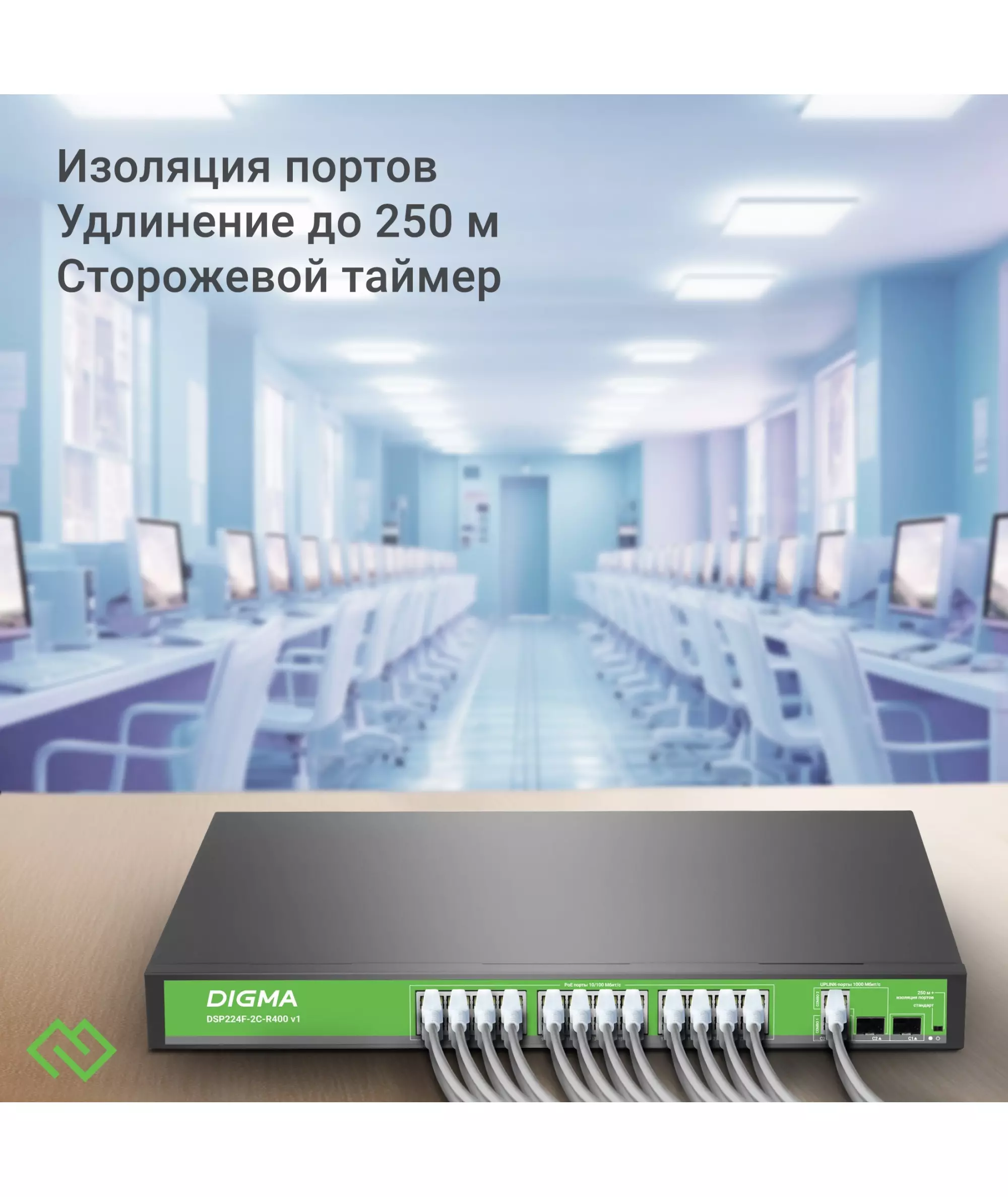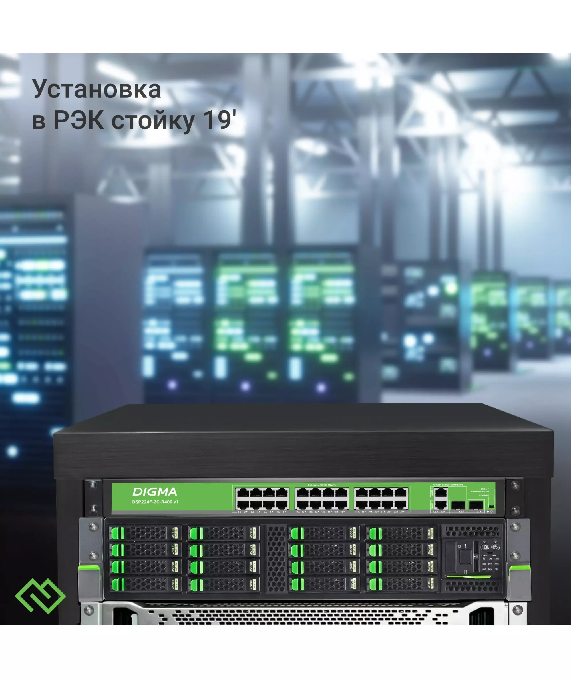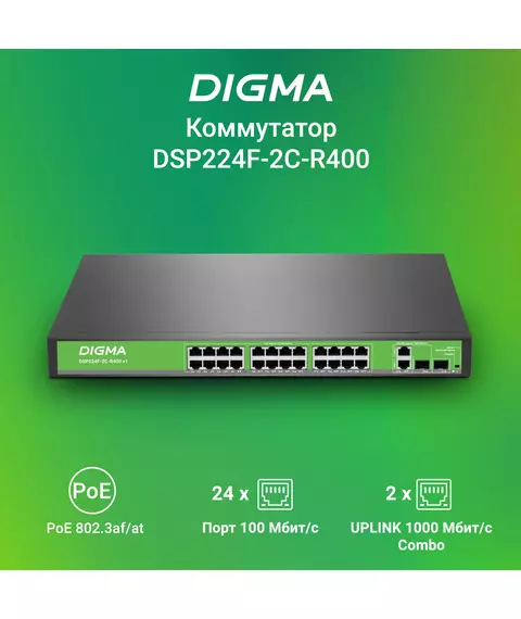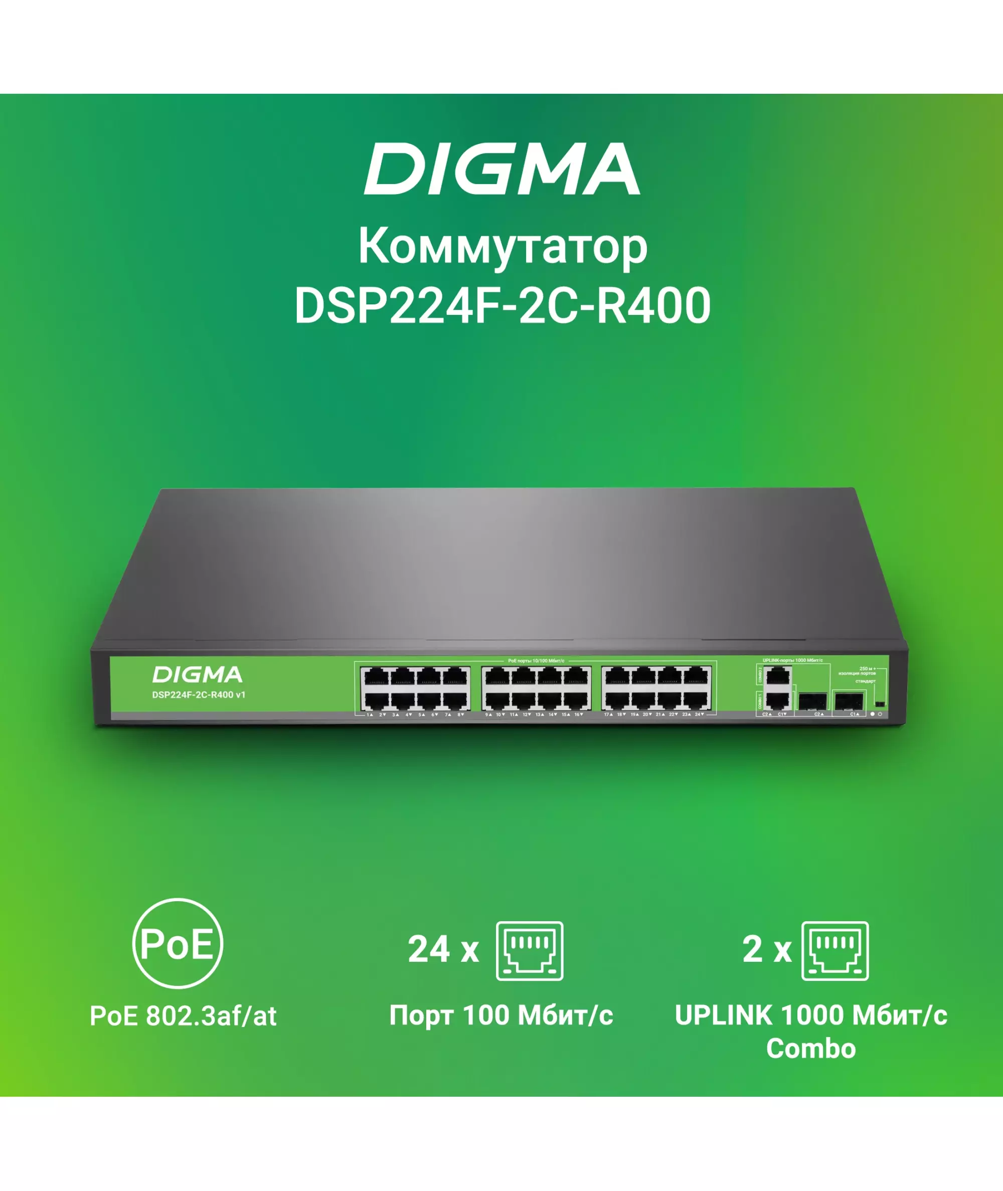 Коммутатор Digma DSP224F-2C-R400 V1 (L2) 24x100Мбит/с 2xКомбо(1000BASE-T/SFP) 24PoE 24PoE+ 400W неуправляемый